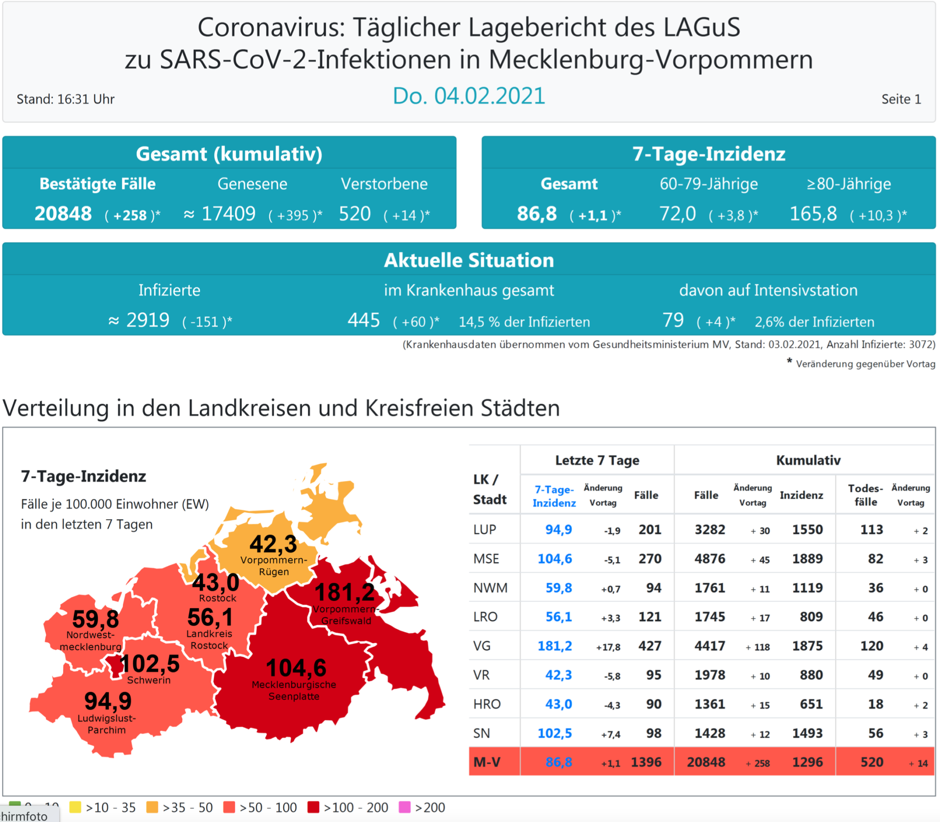 Der Inzidenzwert für ganz Mecklenburg-Vorpommern liegt heute bei 86,8 (gestern 85,7) und steigt damit den zweiten Tag in Folge wieder leicht an. Insgesamt meldet das Land Mecklenburg-Vorpommern heute 258 Neuinfektionen.