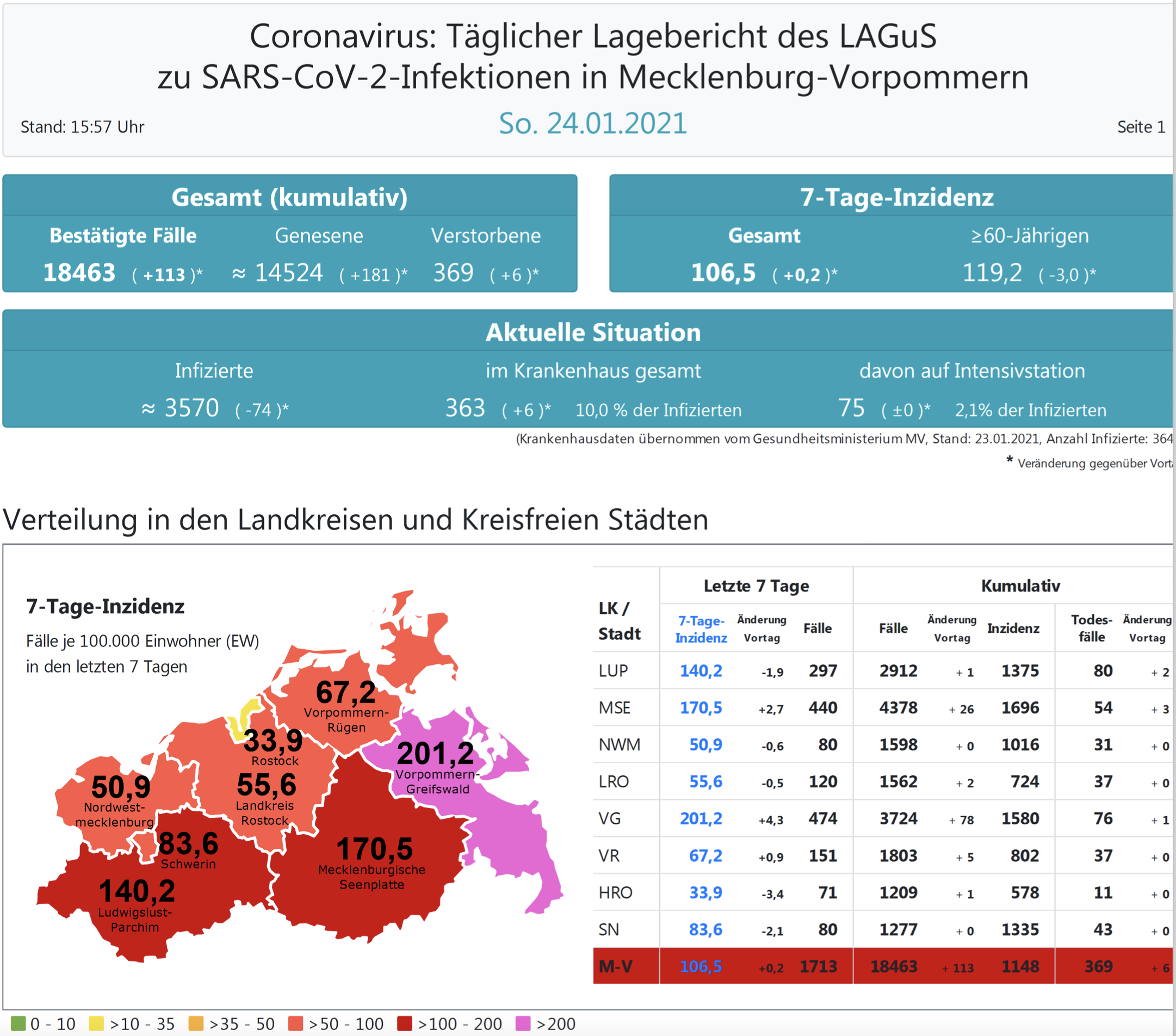 Insgesamt meldet das Land Mecklenburg-Vorpommern heute 113 Neuinfektionen. In ganz Mecklenburg-Vorpommern liegt der Inzidenzwert heute bei 106,5 (gestern 106,3).