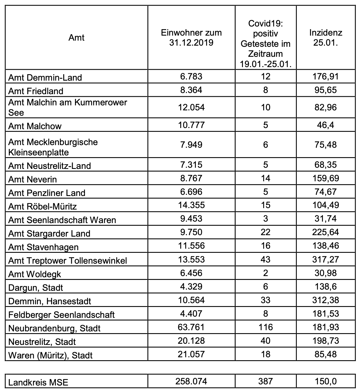 Der Landkreis Mecklenburgische Seenplatte hat heute wieder die Corona-Zahlen – aufgeschlüsselt nach Städten und Ämtern – bekanntgegeben. Demnach hat das Amt Treptower Tollensewinkel mit 317,27 den höchsten Inzidenzwert im Kreis, gefolgt von Demmin mit 312,38 und dem Amt Stargarder Land mit 225,64. Sehr positiv entwickelt hat sich die Inzidenz des Amtes Malchow, die heute mit 46,4 angegeben wird. Im Penzliner Land liegt sie bei 74,67, im Amt Röbel bei 104,49, im Amt Seenlandschaft bei 31,74 und in Waren bei 85,48.