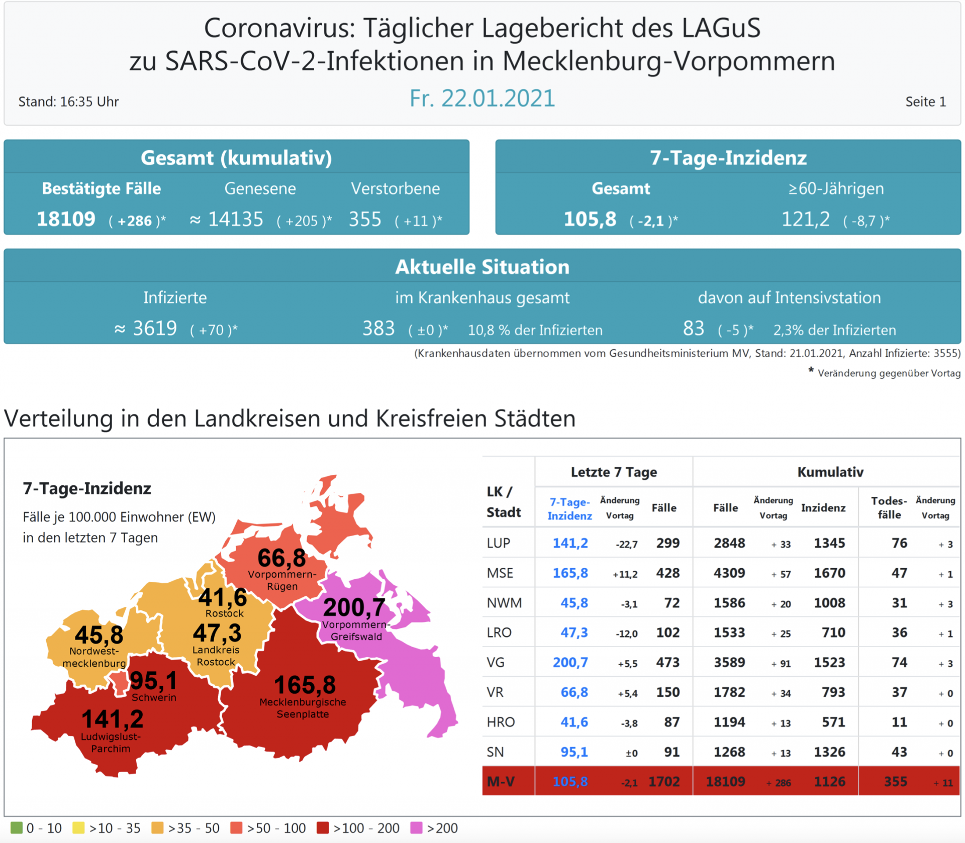 Insgesamt meldet das Land Mecklenburg-Vorpommern heute 286 Neuinfektionen. In ganz Mecklenburg-Vorpommern liegt der Inzidenzwert heute bei 105,8.