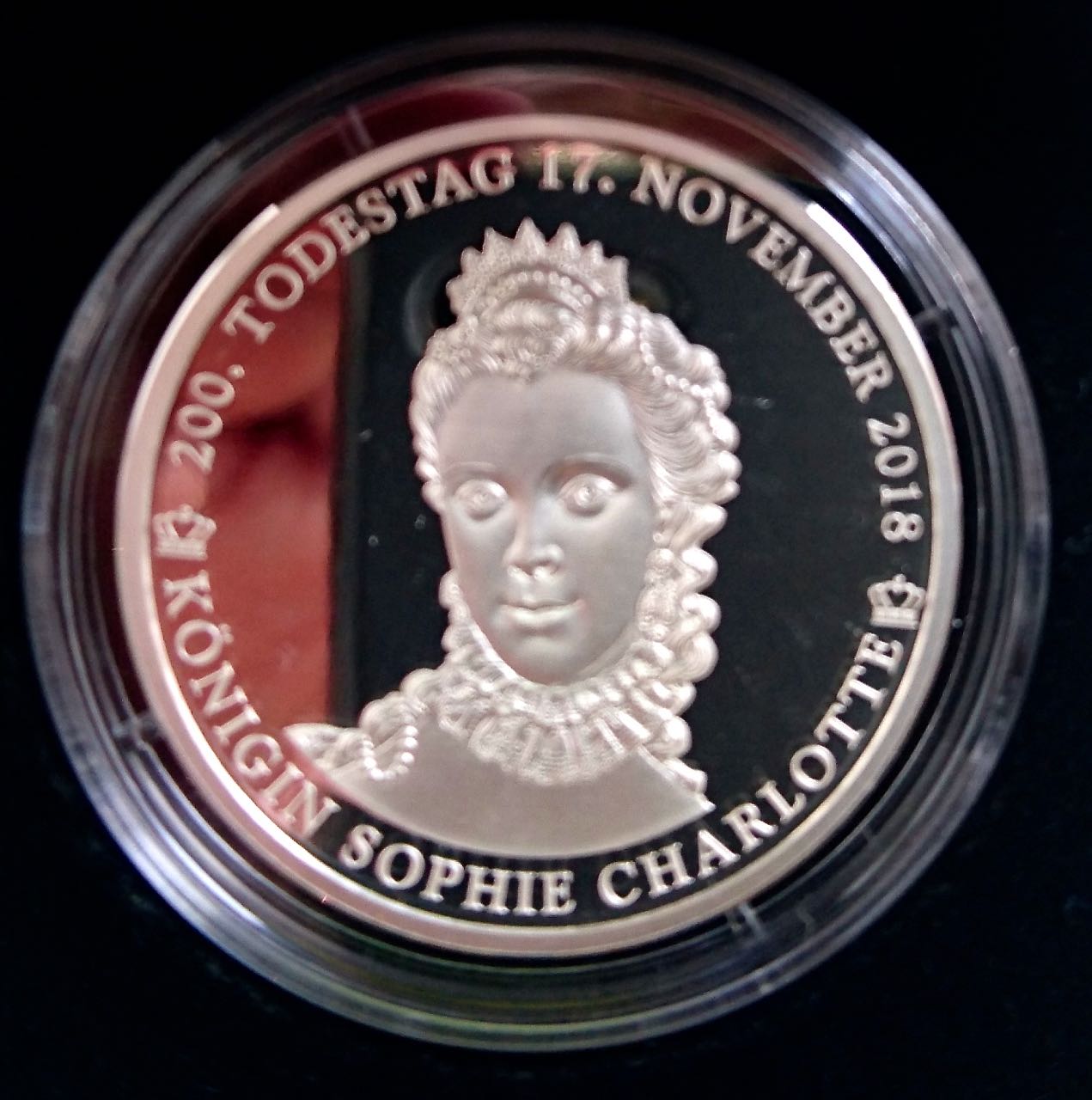 Im November 1818 starb die Königin, was auch als 200. Todestag der Anlass für die 550 neuen Gedenkmünzen – 500 Silbermünzen und 50 in Gold – war.