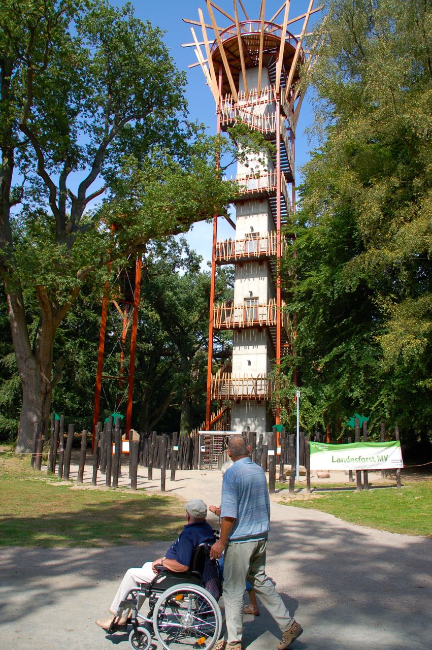 Viele Vereine auch in der Müritz-Region schätzen das Engagement des rüstigen Mannes seit Jahren. So können Besucher in Ivenack nun per Fahrstuhl in 35 Meter Höhe fahren, von der PLattform in die Region blicken und sind damit auf Augenhöhe mit den ältesten Eichen Europas. Der Baumkronenpfad wird von mehreren mit Seile verspannten Pylonen gehalten. Die 620 Meter lange Konstruktion kann auch über eine sanfte Steigung begangen werden. Das taten auch schon die ersten Besucher.