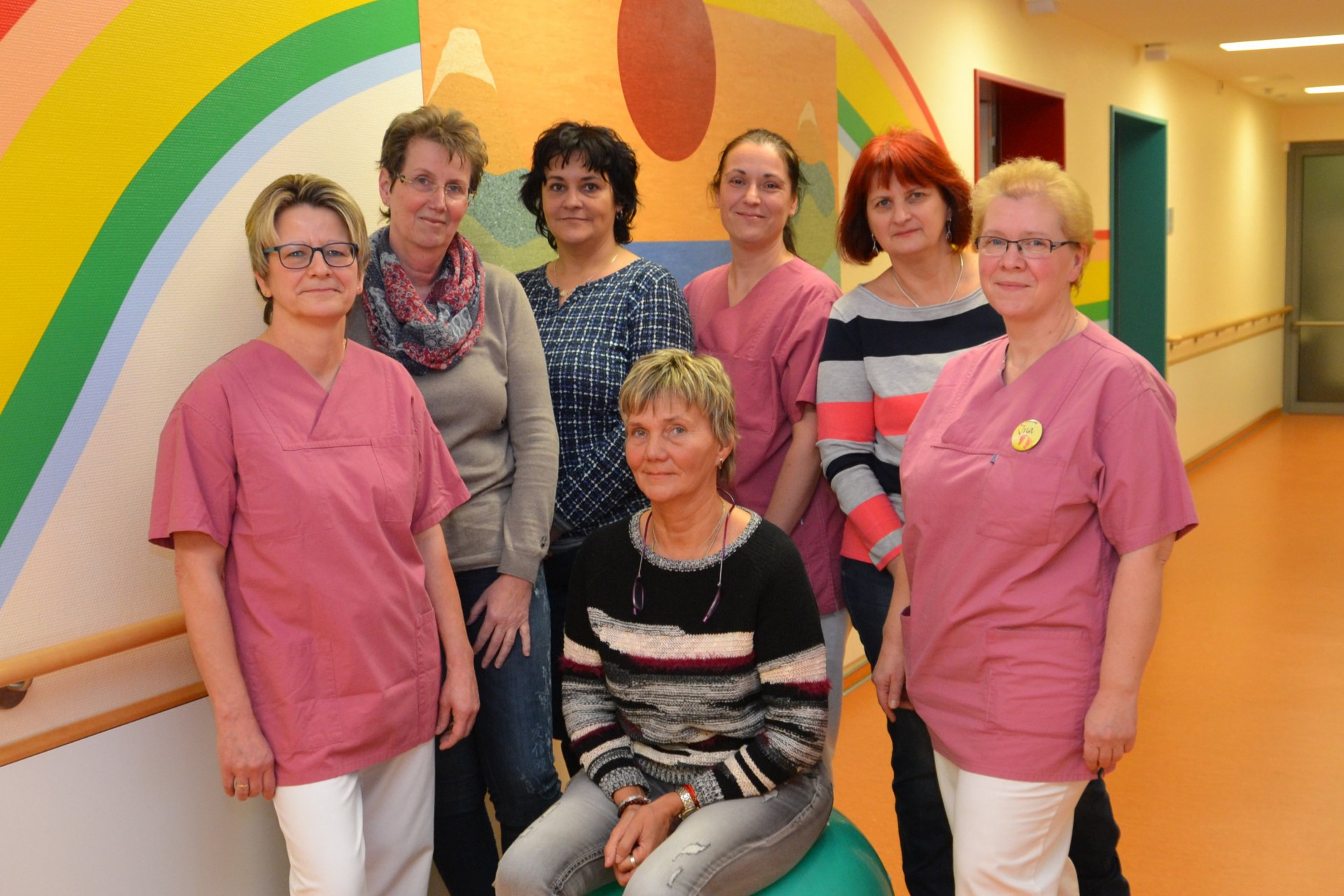 Foto unten: Die Hebammen Cornelia Czerwinski, Kerstin Brasch, Jana Krüger, Nancy Riese, Ingrid Rösing, Ina Markert (v.l.n.r.) und vorne Raymonde Kulessa