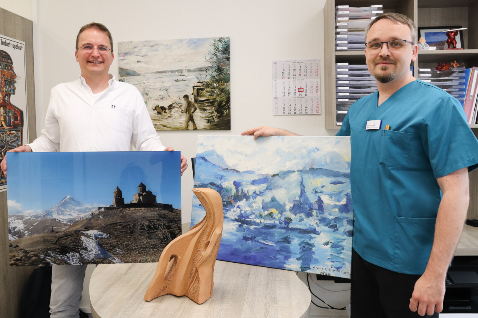 Bild: Dr. med. Michael Hunze (links) und Dr. med. Ronald Wischer mit den Bildern und der Skulptur für die stille Auktion.