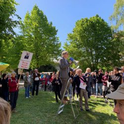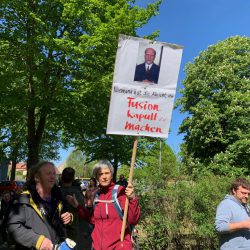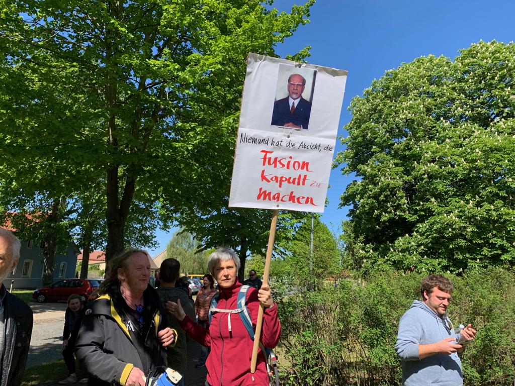 Die vom Protest gegen das Bombodrom bekannte Barbara Lange aus der Region Mirow sorgten mit einem Plakat für Aufsehen, auf dem der ehemalige DDR-Staatsratsvorsitzende und SED-Partei-Chef Walter Ulbricht zu sehen war. Dort stand: „Niemand hat die Absicht, die Fusion kaputt zu machen“. Von dem Moskau-hörigen Politiker stammte der in der DDR sehr bekannte Satz: „Niemand hat die Absicht eine Mauer zu errichten“. Wie es dann 1961 kam, das weiß jeder. Die Mauer hielt 28 Jahre.