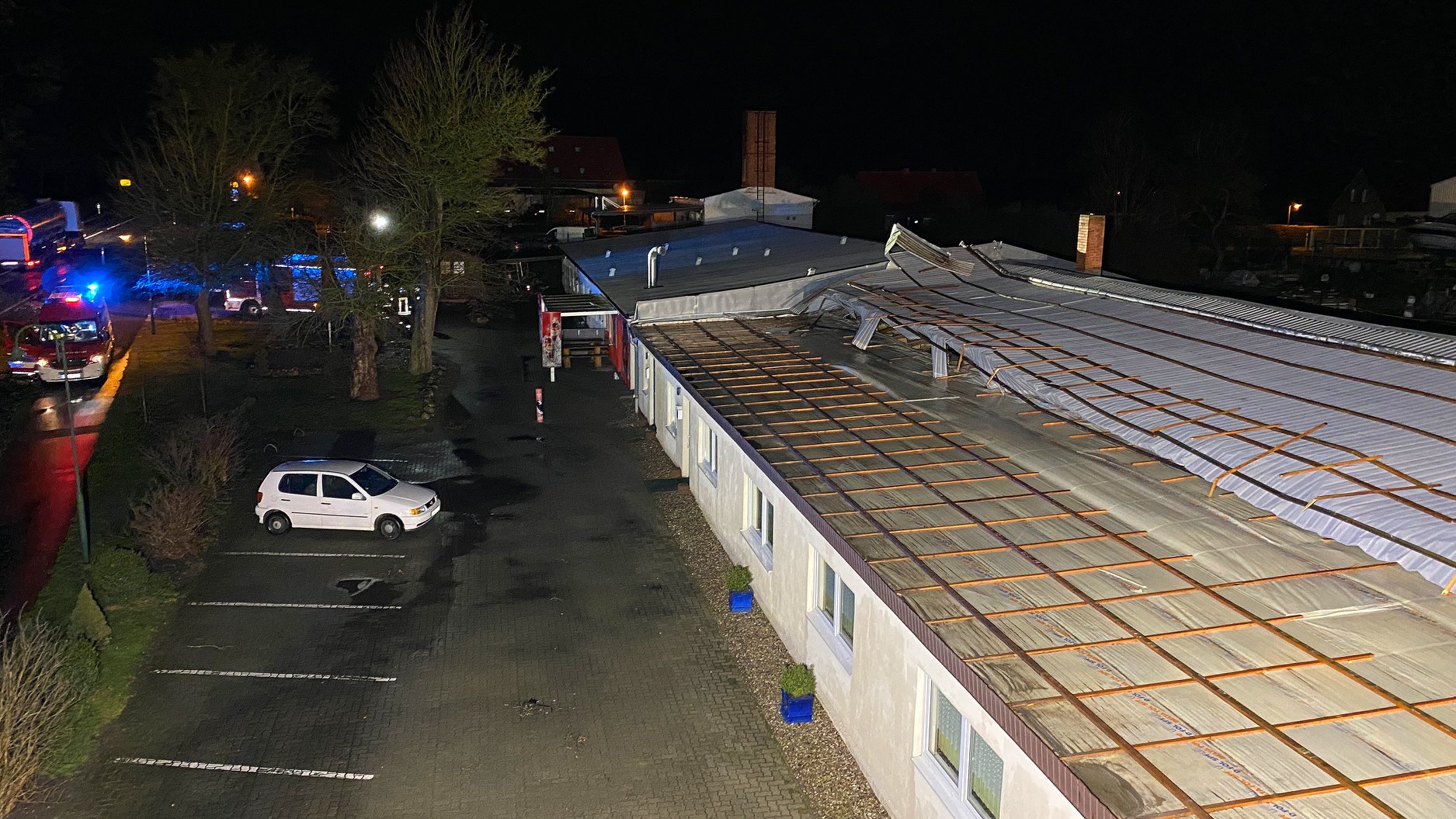 Besonders schwer traf es in der Nacht vier Bewohner eines Mehrfamilienhauses in Penkow bei Malchow im Landkreis Mecklenburgische Seenplatte. Das Dach des Haues wurde durch eine Böe komplett abgedeckt.