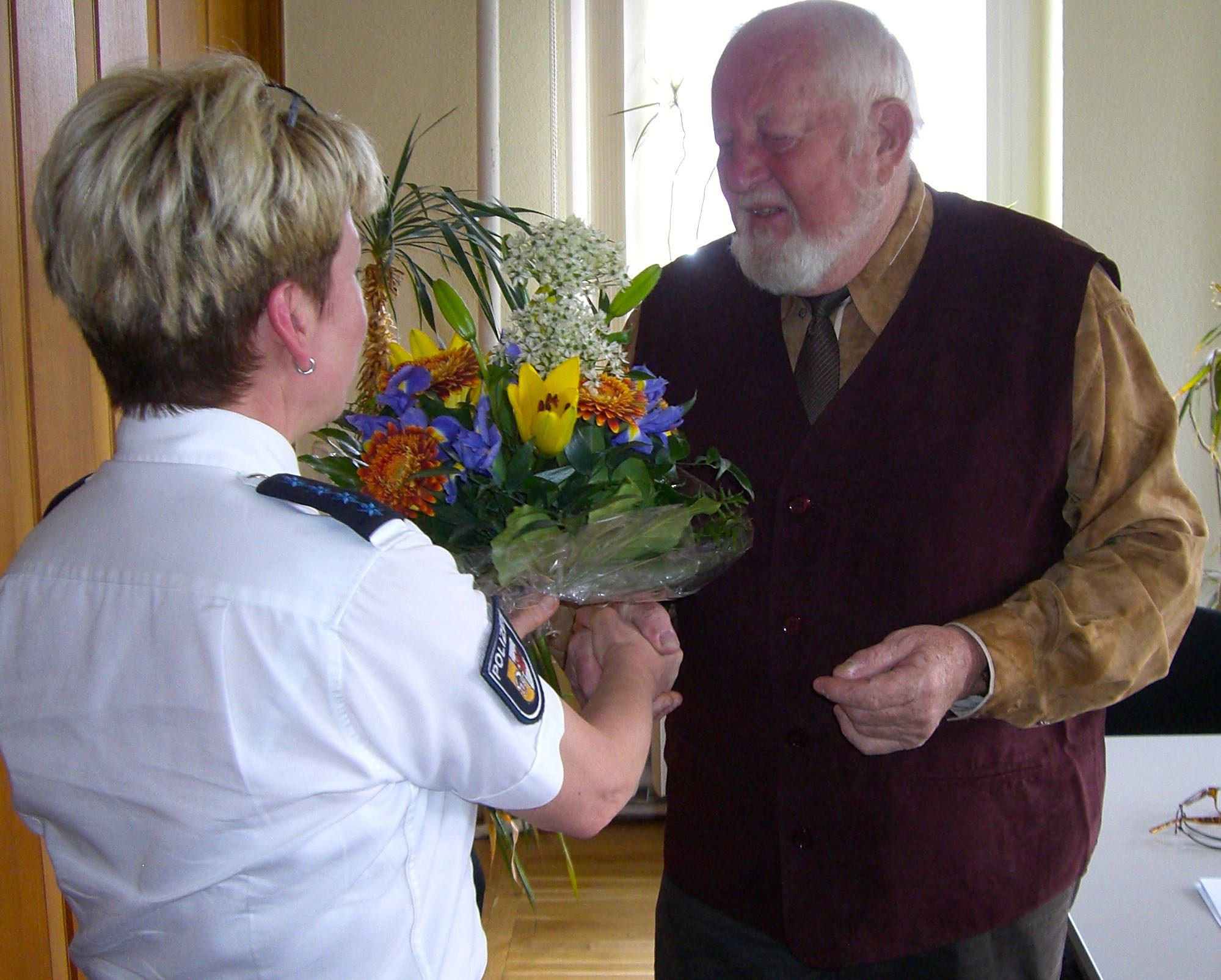 Foto: Bianka Schröder von der Kreisverkehrswacht überreicht Johann Kratzwohl die Auszeichnung für über 50 Jahre unfallfreies Fahren.