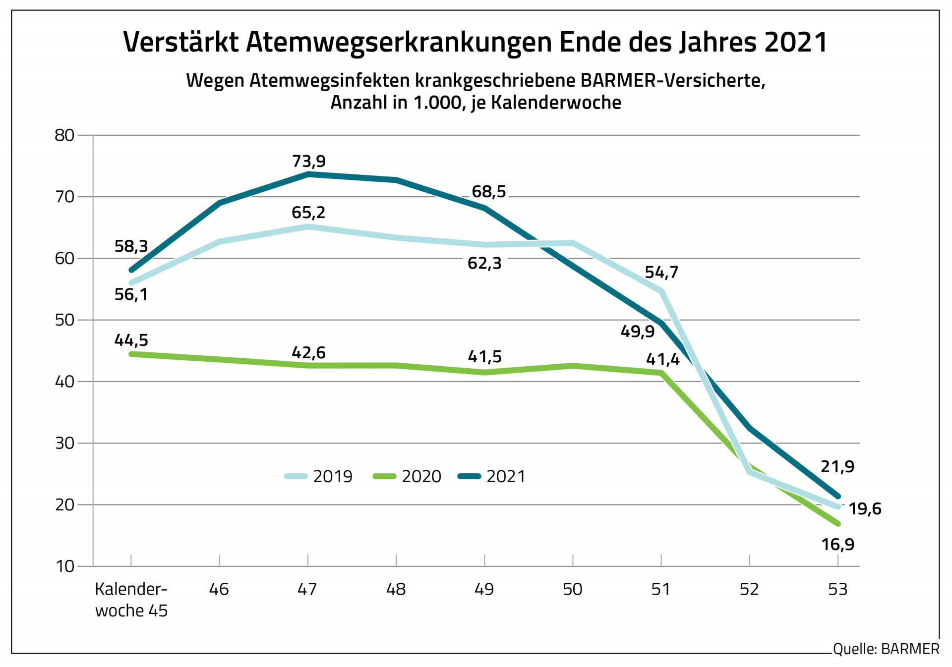 „Die Erkältungswelle war im vergangenen Winter vergleichsweise flach. Deshalb dürfte der Antikörperschutz bei vielen Menschen nun etwas geringer sein, wodurch Atemwegsinfekte leichter auftreten können“, sagt Prof. Dr. Christoph Straub, Vorstandsvorsitzender der BARMER. Auch in den letzten beiden Kalenderwochen des Jahres 2021 habe es mehr Atemwegsinfekte gegeben als in den Vorjahreszeiträumen. Hier sei die Zahl der Krankschreibungen wegen der Weihnachtsferien aber grundsätzlich geringer.