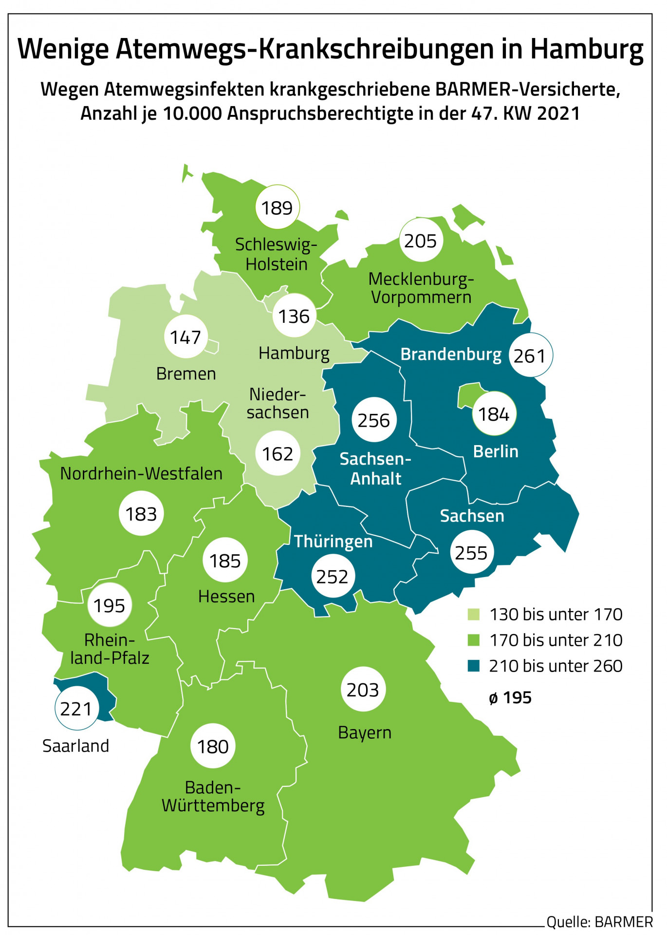 Wie aus der BARMER-Analyse weiter hervorgeht, hat es gegen Ende des Jahres 2021 überdurchschnittlich viele Krankschreibungen wegen Atemwegsinfekten in Brandenburg, Sachsen-Anhalt, Sachsen und Thüringen gegeben. In Kalenderwoche 47 waren in diesen vier Bundesländern zwischen 252 und 261 je 10.000 BARMER-versicherten Krankengeld-Anspruchsberechtigten arbeitsunfähig.