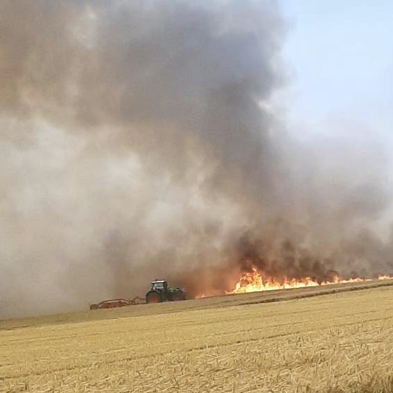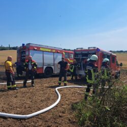 Eine halbe Stunde später, gegen 14.30 Uhr kam es zu einem dritten Brand im Zusammenhang mit Erntearbeiten. Zwischen Carolinenhof und der B194 brannten ca. 10 Hektar eines bereits abgeernteten Feldes und weitere fünf Hektar mit Gerste. Dabei entstand ein Schaden von ca. 6000 Euro. Auch hier unterstützen Landwirte die Feuerwehren.