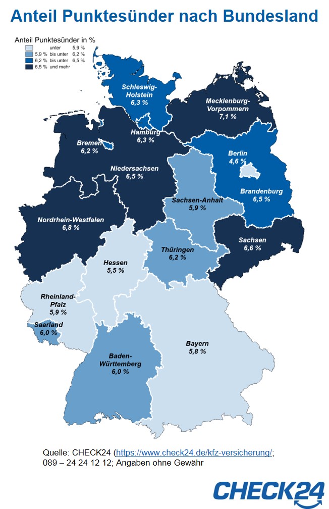 Unter den Bundesländern hat Mecklenburg-Vorpommern den höchsten Anteil an Punktesündern (7,1 Prozent), gefolgt von Nordrhein-Westfalen (6,8 Prozent). Berliner haben auch im Ländervergleich die wenigsten Einträge im Fahreignungsregister (4,6 Prozent).