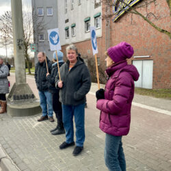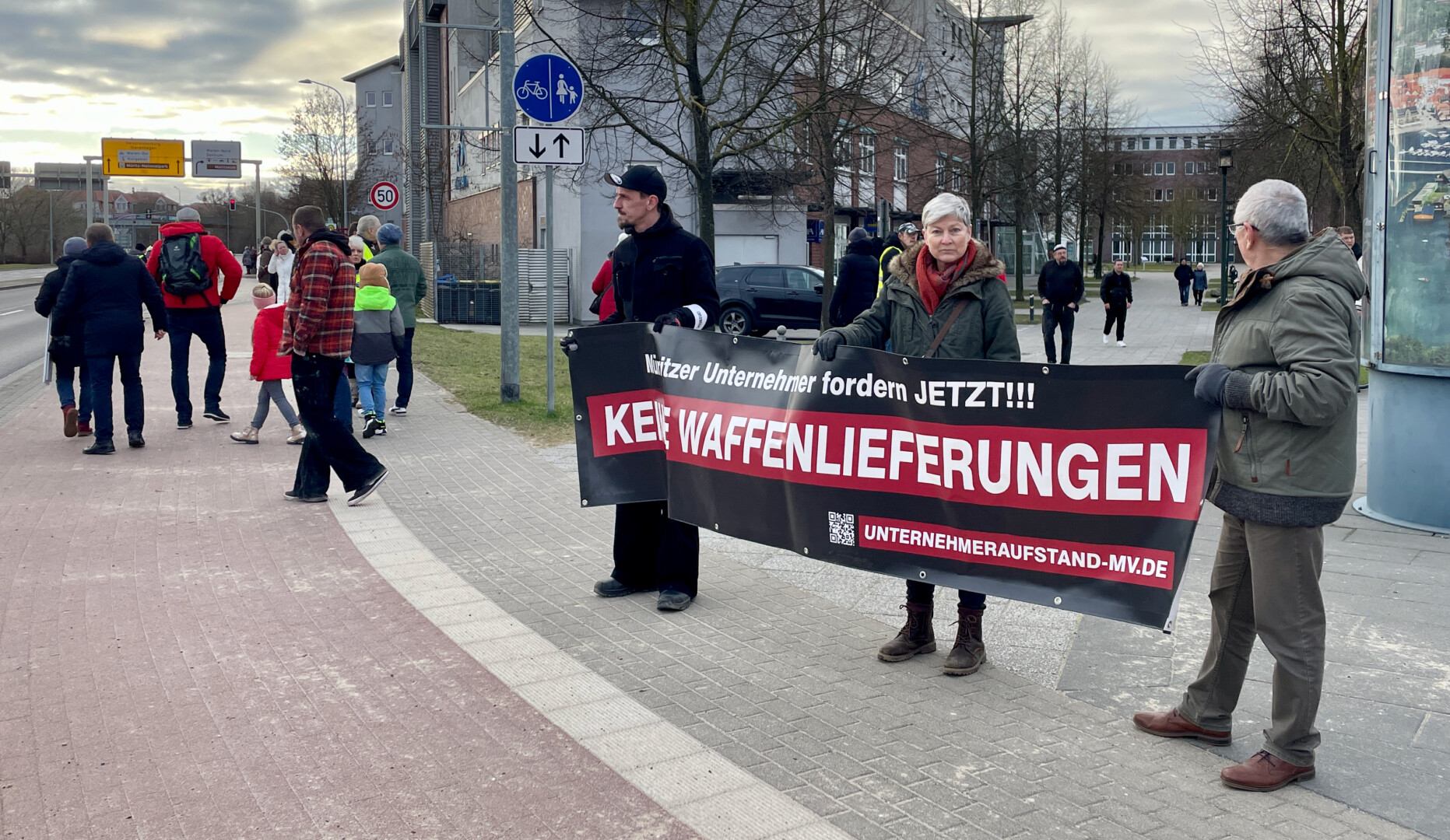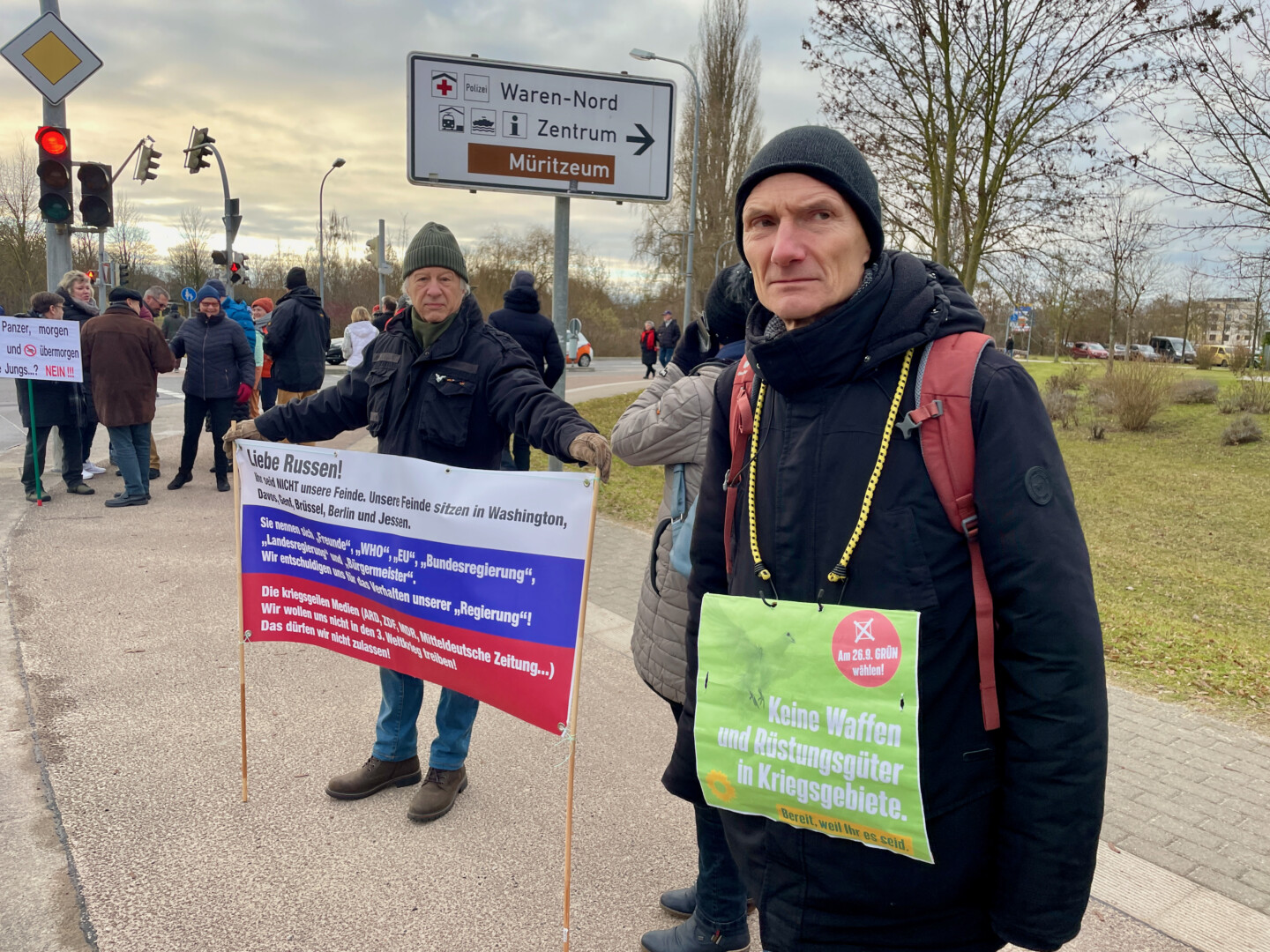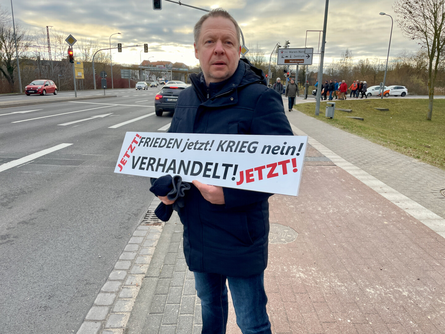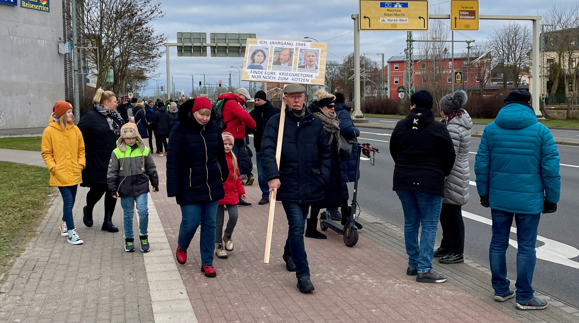 Ähnlich sieht es eine Familie, die gleich mit drei Generationen vertreten war. „Man muss nicht immer mit der Politik einverstanden sein, aber deshalb laufen wir nicht gleich auf die Straße. Doch was in dieser Woche passiert ist, besorgt uns sehr. Wir halten die Lieferung der Panzer für falsch und befürchten, dass das alles ganz schlimm endet. Es muss doch einen anderen Weg geben, diesen Krieg in der Ukraine zu beenden. Waffen sind nicht das richtige“, erzählt ein Warener Opa, der gemeinsam mit seiner Frau, seinem Sohn, Schwiegertochter und zwei Enkeln am Schweriner Damm stand. Eines ist ihm ganz wichtig: „Wir möchten unseren Protest zeigen, aber ganz, ganz friedlich. Wir hoffen, dass es friedlich bleibt in unserer schönen Stadt.“