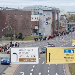 Die „Kette“ reichte etwa vom „JOO!“ bis zum Altstadtcenter: Rund 400 Müritzer – die Veranstalter sprechen von 500 – haben heute Vormittag eine Menschenkette für den Frieden am Schweriner Damm gebildet. Sie folgten damit dem Aufruf der Initiative „Menschlich-Stark-Miteinander“, sie seit vielen Monaten die Montagsdemonstrationen in Waren organisiert und sich dabei sehr kritisch mit der aktuellen Politik auseinander setzt. Die Organisatoren der heutigen Menschenkette wenden sich vor allem gegen die Waffenlieferungen an die Ukraine und fordern stattdessen Verhandlungen. Organisator Markus Häcker erklärte im Vorfeld, dass es sich um keine „Gegenveranstaltung“ zum zeitgleich im „JOO!“ stattfindenden Gedenken an die Opfer des Nationalsozialismus handelt.