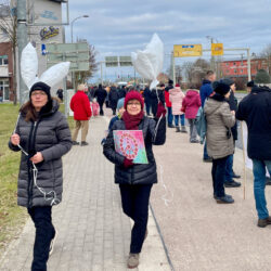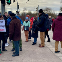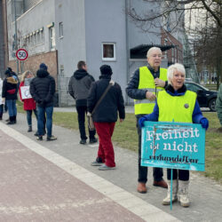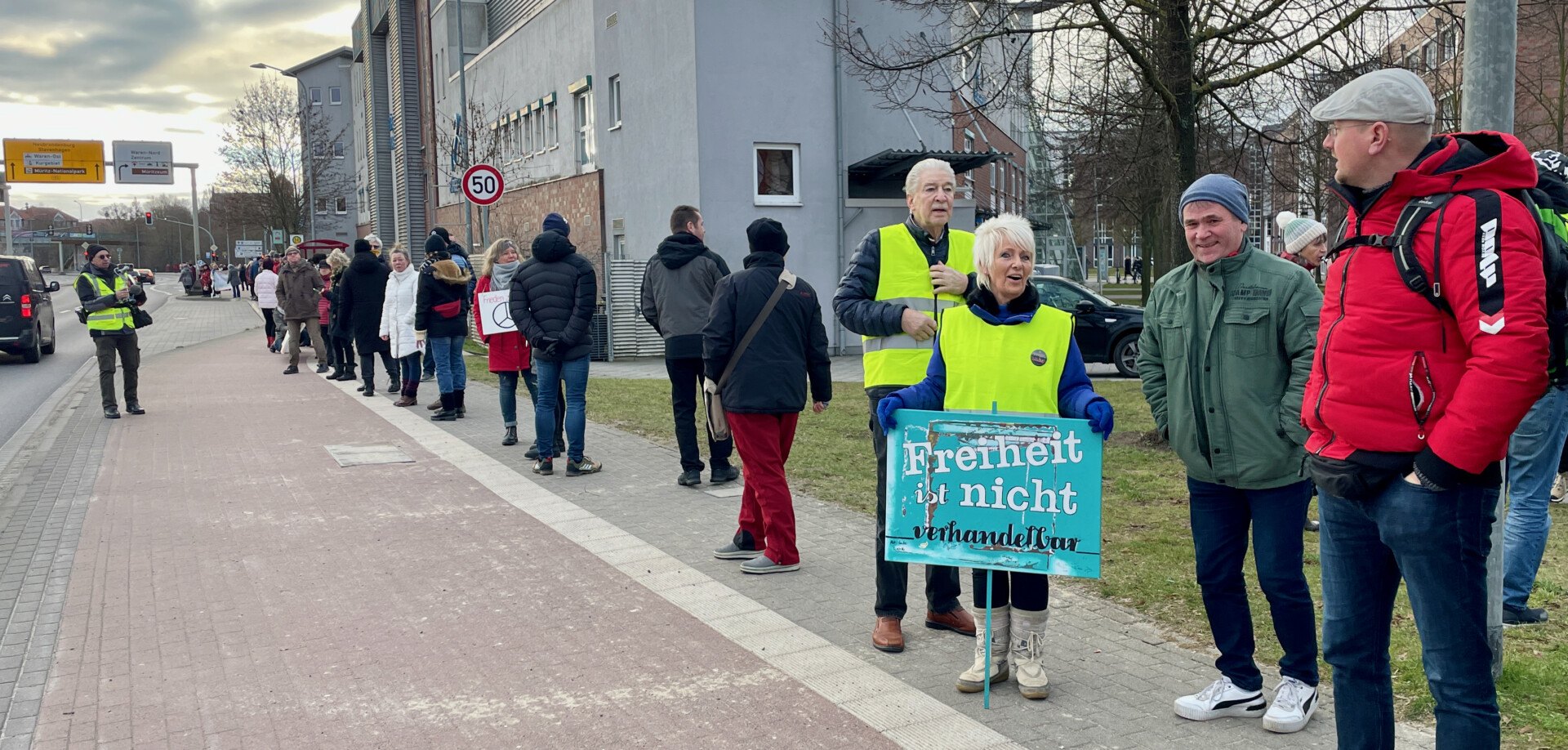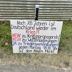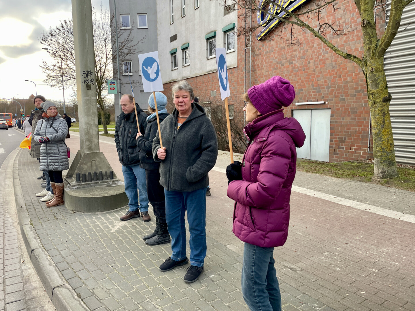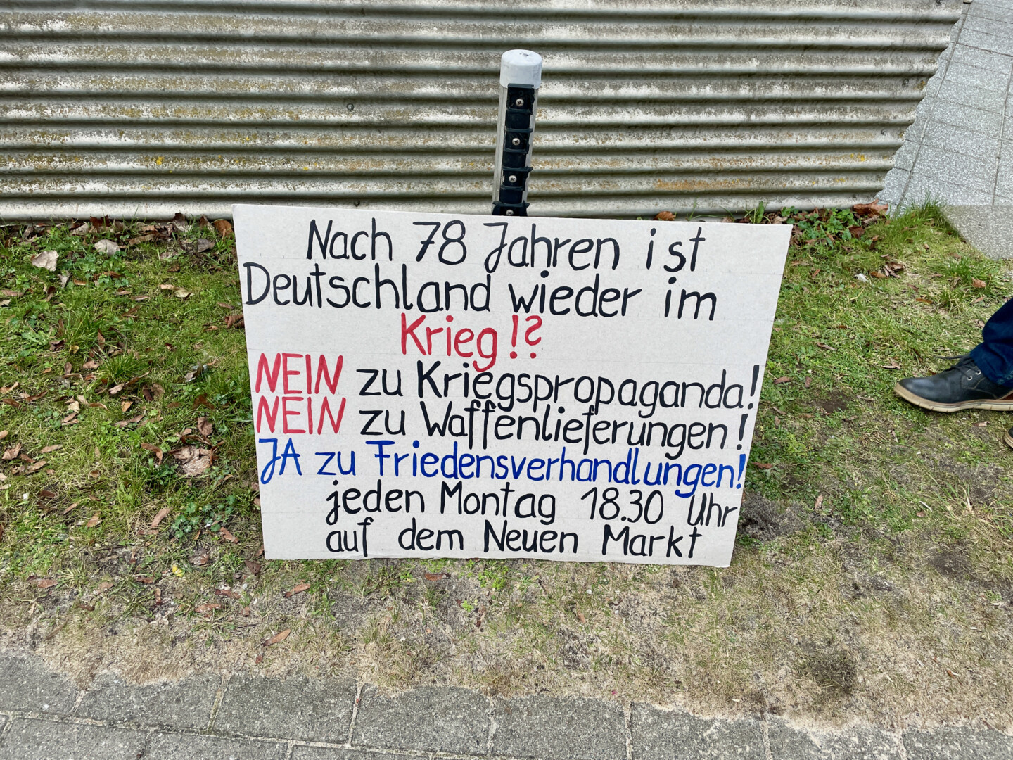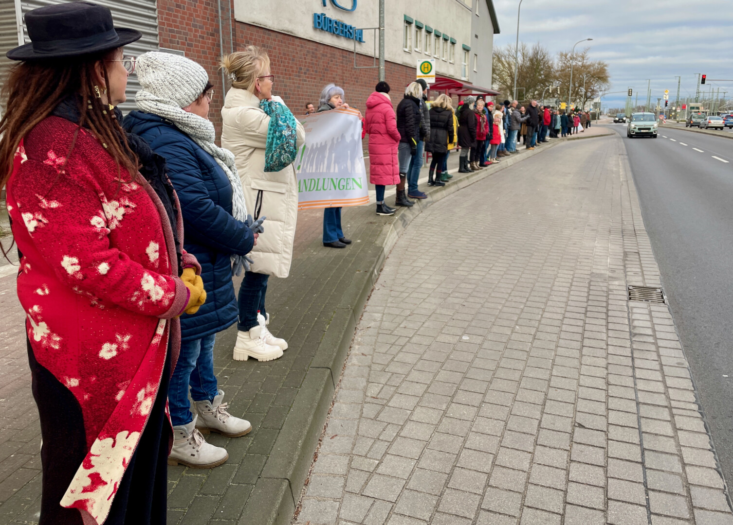 Unter den Teilnehmern der Menschenkette waren viele, die bislang nicht bei den Montagsdemonstrationen auf dem Neuen Markt dabei waren. „Ich will einfach nur zeigen, dass ich mit den Panzerlieferungen nicht einverstanden bin und Angst vor einem Weltkrieg habe. Was die Initiative sonst so macht, ist eigentlich nicht mein Ding“, erklärte beispielsweise Sybille.
