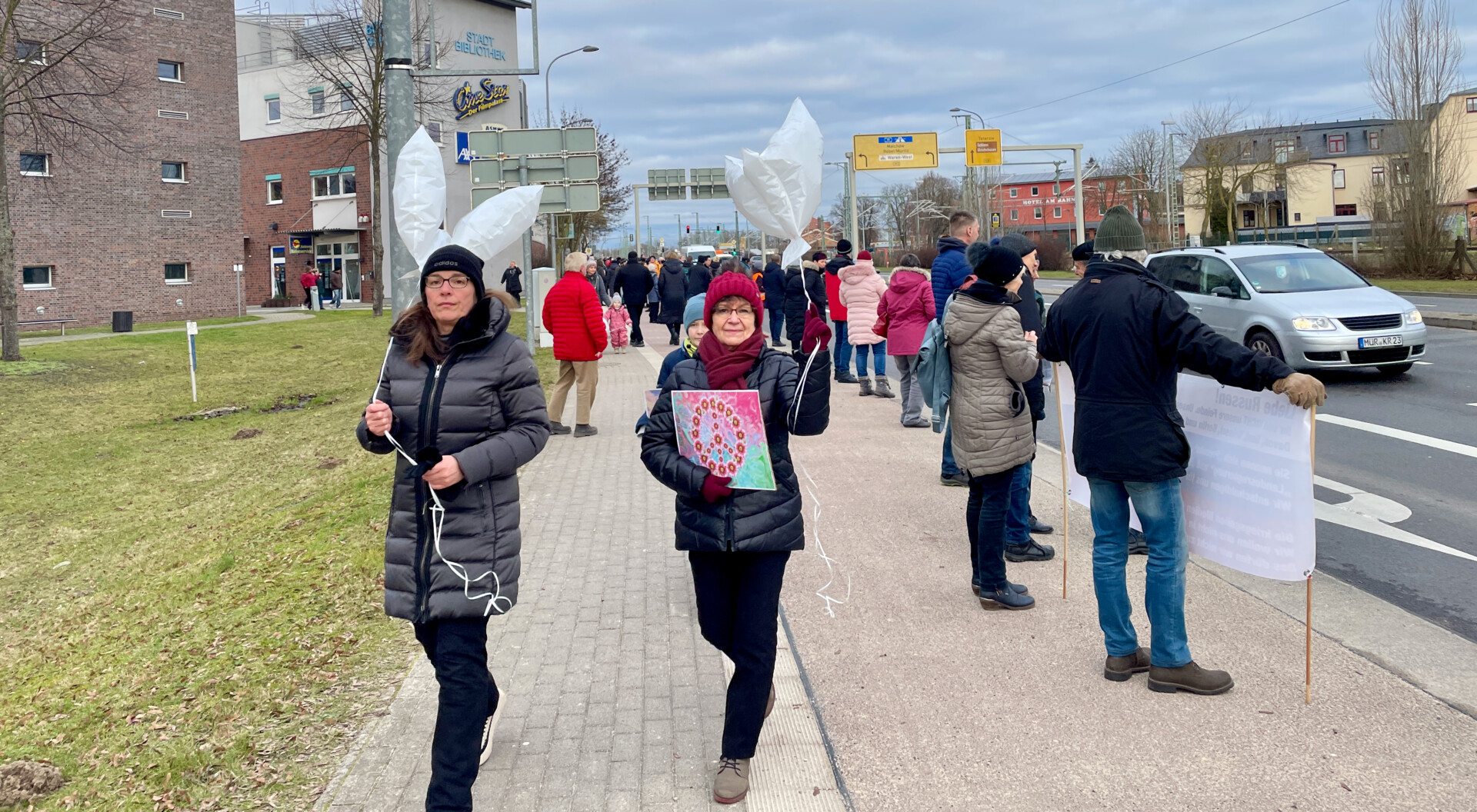 Während der Menschenkette bekundeten zahlreiche Autofahrer durch Hupen und Winken ihre Sympathie mit den Demonstranten, die gut eine Stunde lang den Schweriner Damm säumten.
