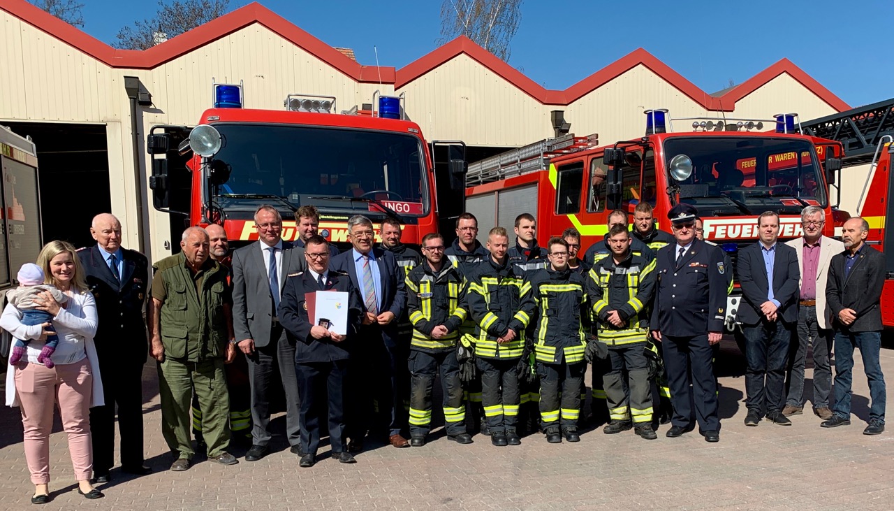 Für die Freiwillige Feuerwehr Waren gab’s schon vor Ostern ein richtig dickes Geschenk: Innenminister Lorenz Caffier (CDU) hat heute einen Fördermittelbescheid über 130 000 Euro für ein neues Löschfahrzeug vorbeigebracht. Das alte hat schon mehr als 25 Jahre auf dem Buckel und soll ausgetauscht werden. Alles in allem kostet das neue Fahrzeug rund 320 000 Euro – neben den Fördermitteln vom Land kommen auch noch 30 000 Euro vom Kreis, die Stadt Waren zahlt etwa 160 000 Euro.