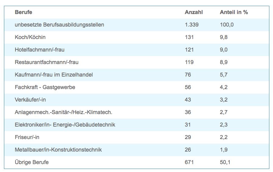 Die größten Stellenbesetzungsprobleme bestehen im Hotel- und Gaststättenbereich. Dort setzt sich der Trend der letzten Jahre fort. Von den insgesamt 1.339 offenen Stellen konnten im Hotel- und Gaststättenbereich 427 Stellen (rd. 31,9 %) bisher nicht besetzt werden. In den Top 10 der unbesetzten Ausbildungsstellen liegen die ersten drei Berufe im Hotel- und Gaststättenbereich: Koch/Köchin (131 offene Stellen), Hotelfachmann/frau (121), Restaurantfachmann/frau (119) und auf Platz 5 der Beruf Fachkraft im Gastgewerbe (56).