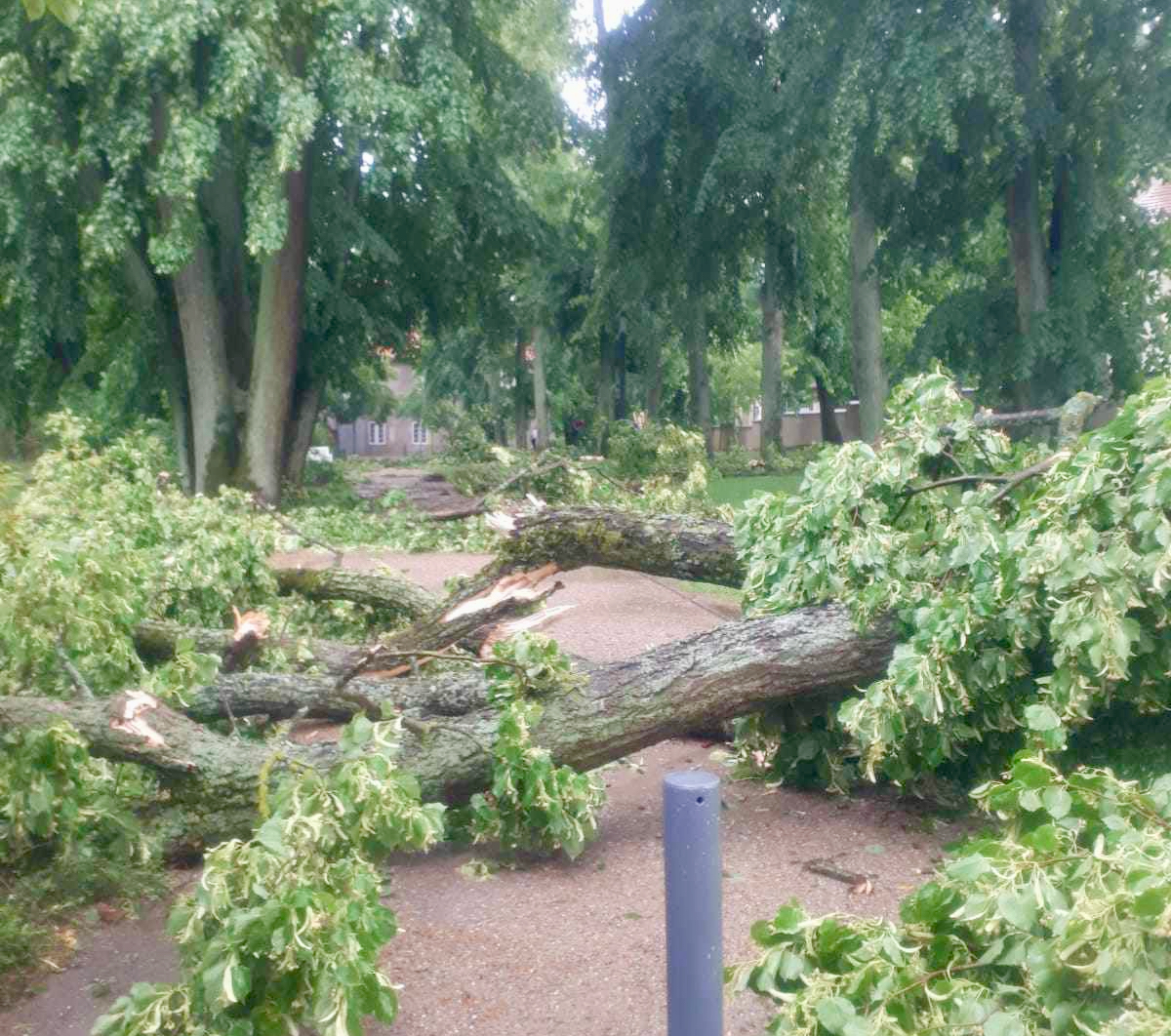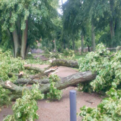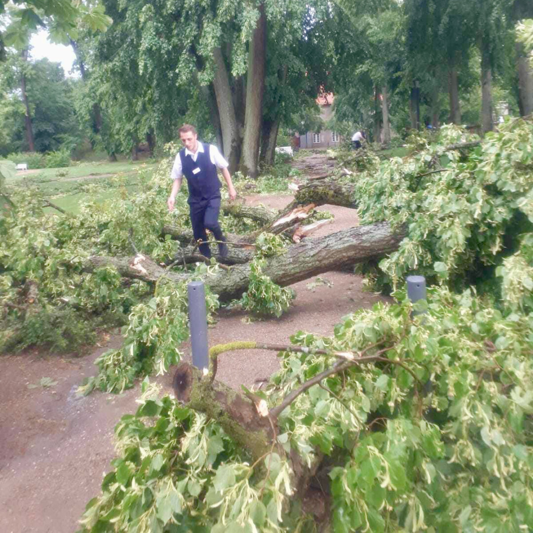 Während die Müritz-Region beim gestrigen Gewitter ziemlich glimpflich davon gekommen ist, hat der Sturm etwas weiter südlich in Mirow richtig gewütet. Im Bereich der Mirower Schlossinsel knickten zahlreiche Bäume ab, andere dicke Bäume wurden gar entwurzelt, Außenmöbel flogen durch die Gegend, Lampen am Wegesrand zersprangen.