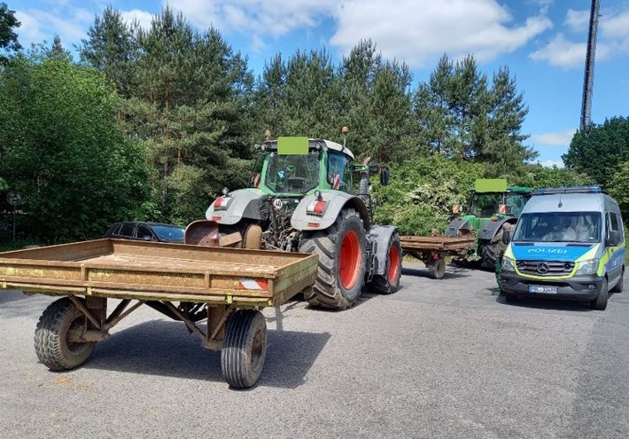 An der Abfahrt nach Hohenzieritz haben die Beamten beide landwirtschaftlichen Fahrzeuge samt Anhänger angehalten und kontrolliert. Die beiden 55- und 56-jährigen Fahrzeugführer arbeiten für eine Agrargesellschaft in der Region. Sie wollten mit den Fahrzeuggespannen auf eine ca. 40 Kilometer entfernte Ackerfläche fahren.
