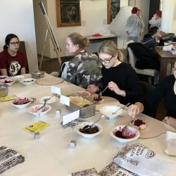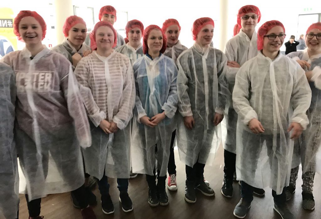 Viele staunende Blicke gab’s beim Rundgang durch die Produktion, denn mit so viel Handarbeit hatten die Mädchen und Jungen gar nicht gerechnet. Und auch nicht mit so vielen Hygenievorschriften. Nicht nur, dass die Schüler sich „verkleiden“ mussten und mit Kittel und Haube ausgestattet wurden. Einige betraten die Bäckerei auch mit blauen Pflastern an der Nase oder den Ohren. Denn wer sein Piercing oder Ohrring nicht entfernen konnte oder wollte, musste es abkleben. Aus Sicherheitsgründen, der so ein Piercing möchte wohl kein Kunde im Brot finden.