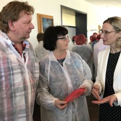 Mit blauem Pflaster an der Nase auf Produktions-Rundgang