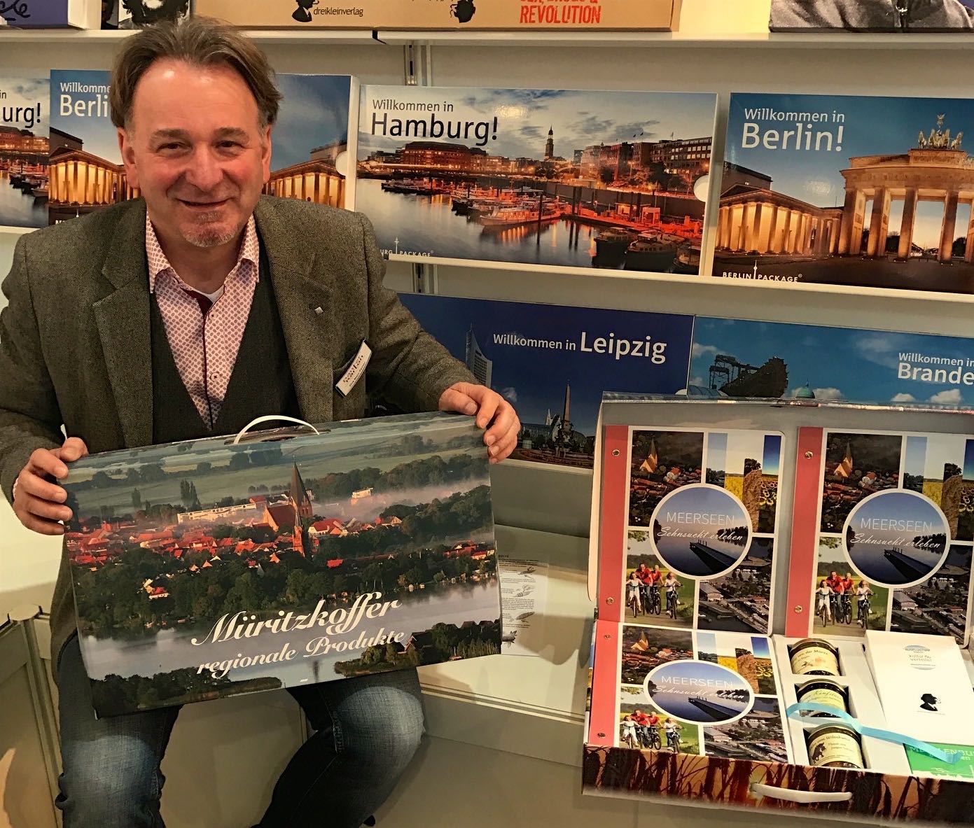 Foto unten: Dirk Klein-Panter präsentiert in Leipzig den „Müritzkoffer“.