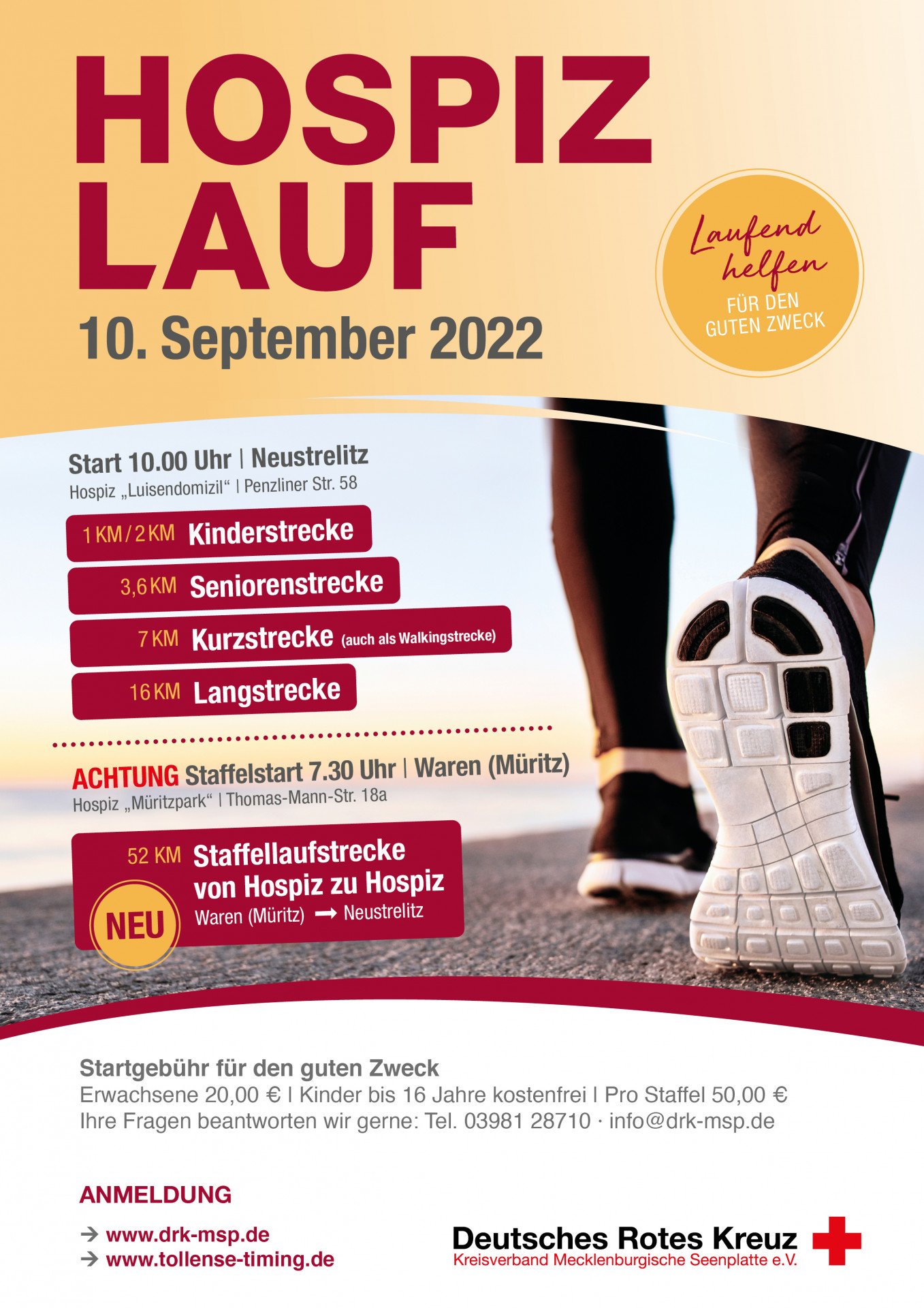 „Laufend helfen“ ist das Motto des DRK-Hospizlaufes, der am 10. September nun schon zum neunten Mal stattfindet und der mit einer Neuerung aufwartet: Erstmals wird es auch einen Staffellauf geben, und zwar vom Warener Hospiz in der Thomas-Mann-Straße zum Neustrelitzer Hospiz. Bereits seit vielen Jahren unterstützt der DRK Kreisverband Mecklenburgische Seenplatte e.V. zusammen mit Ehrenamtlichen schwerkranke Menschen und ihre Angehörigen in der letzten Lebensphase.