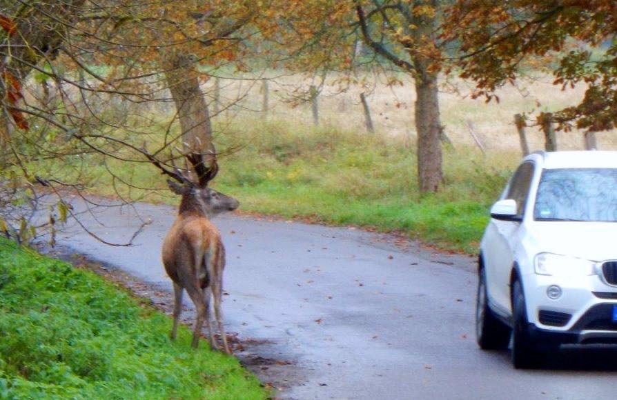 Diese Bild ist heute am frühen Nachmittag in Speck entstanden. Auf den Auslöser hat Rangerin Martina Fuhrmann gedrückt. Der Hirsch am helllichten Tag im Gegenverkehr mitten im Nationalpark zeigt auch, dass Wildtiere sichtbarer werden, wenn es Jagdruhezonen gibt – wie dort in der Umgebung. Johannes Herweg, Revierleiter im Müritz-Nationalpark, hat den Hirsch in Augenschein genommen. Er ist vermutlich von der Brunft geschwächt.
