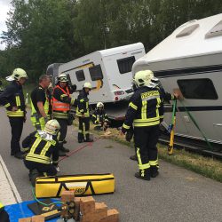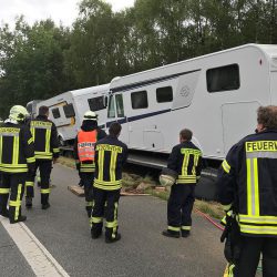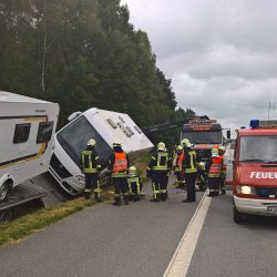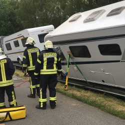 Ein Wohnmobil geriet dabei so dermaßen in Schieflage, dass die Feuerwehr zum Einsatz kommen musste. Die Kameraden mussten den Anhänger mit Hebekissen absichern. Der Feuerwehr gelang es schließlich, den Schaden zu begrenzen. Laut Polizei beträgt der entstandene Sachschaden rund 10.000 Euro.