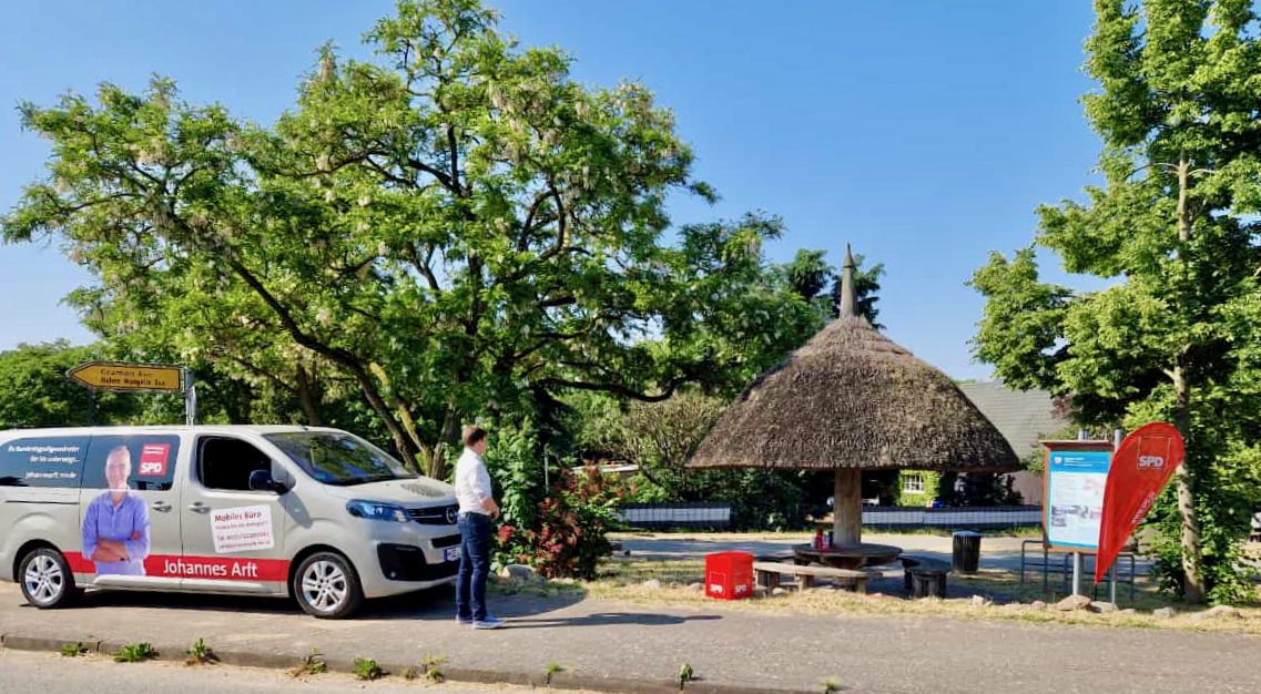 Das mobile Büro des SPD-Bundestagsabgeordneten Johannes Arlt fährt in dieser Woche von Dienstag bis Donnerstag durch die südliche Müritz-Region und macht Station in Retzow, Boek, Solzow, Ludorf, Altenhof und Fincken. Tisch und Bänke werden aufgestellt. Getränke, Papier und Stift und Laptop liegen für Bürgergespräche bereit.