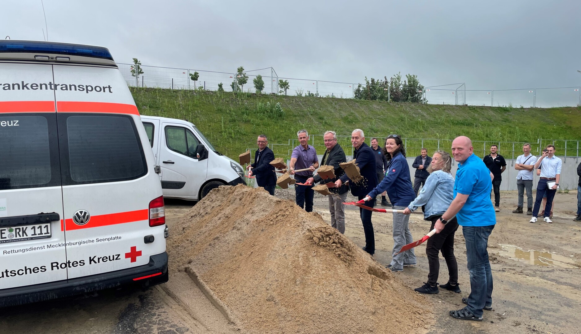 Foto unten: Torsten Haker, Björn Liefke von Warnemünde Bau, Thomas Müller, Dirk Rautmann, Anja Morgenstern (stellv. Betriebsleiterin Eigenbetrieb Rettung), die Altentreptower Bauamtsleiterin Hendrikje Kmietzyk und Thomas Orlishausen vom DRK Kreisverband Demmin beim Spatenstich (von links)