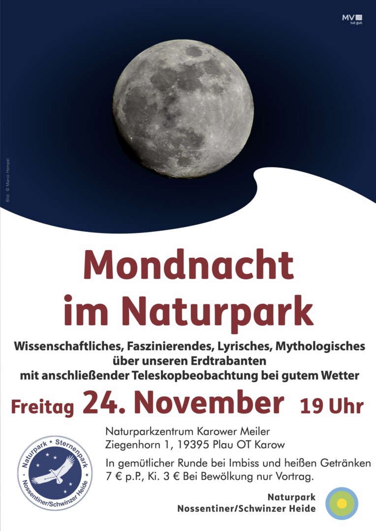 Der Mond ist unser ständiger Begleiter und er soll am Freitag im Naturparkzentrum Karower Meiler im Mittelpunkt stehen. „Entdecken Sie mit uns das Mondgesicht – oder wer es genauer wissen möchte: Mare, Krater und Gebirge. Nicht nur Goethe war sein Leben lang vom Mond fasziniert. Lauschen Sie auch den spannenden Mondmythen der Azteken und anderer Völker“, heißt es in der Einladung.