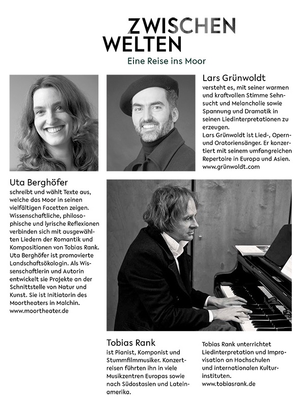 Mit einem Wechsel von Texten, Liedern und klassischer Musik zeigen die drei, dass das Moor mehr ist als eine mystische Landschaftserscheinung. Die Besucher gehen auf eine stimmungsvolle und nachdenkliche Reise vom historisch geprägten Bild der Moore bis hin zu den aktuell wieder verstärkt geforderten Nutzungsmöglichkeiten, die diese nachhaltigen Ökosysteme bieten.