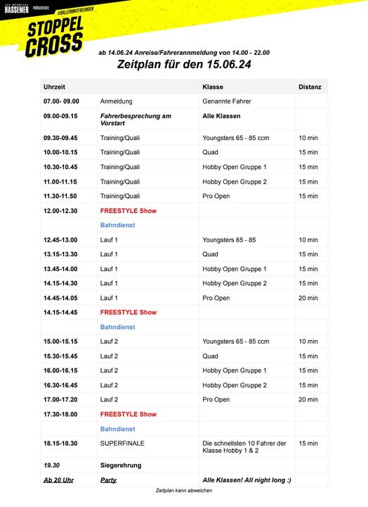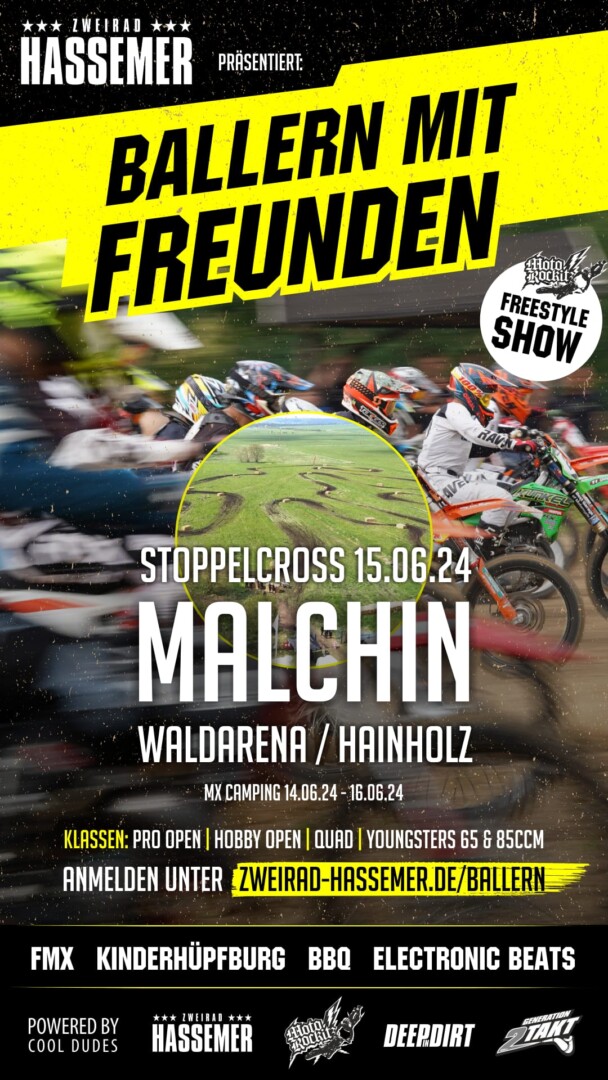 Am kommenden Sonnabend, 15. Juni, startet in der Malchiner Waldarena ein Motorsport-Event der Extraklasse. Das Team von Zweirad Hassemer lädt zu einem spektakulären Stoppelcross-Rennen ein, bei dem über 100 Fahrer in den Klassen Youngsters, Hobby, Quad und Pro antreten werden. Das Rennen findet auf einer abgesteckten Wiese statt, die speziell für Moto-Cross-Maschinen präpariert wurde. Die Trainingsläufe beginnen am Vormittag, während es ab 12.45 Uhr in den Rennläufen ernst wird. In den Pausen zwischen den Läufen werden die Zuschauer durch atemberaubende Freestyle-Shows von Tobias Fink und Mikolaj Tempka aus Polen begeistert. Besucher können sich auf beeindruckende Stunts wie Backflips und weitere spektakuläre Tricks freuen.