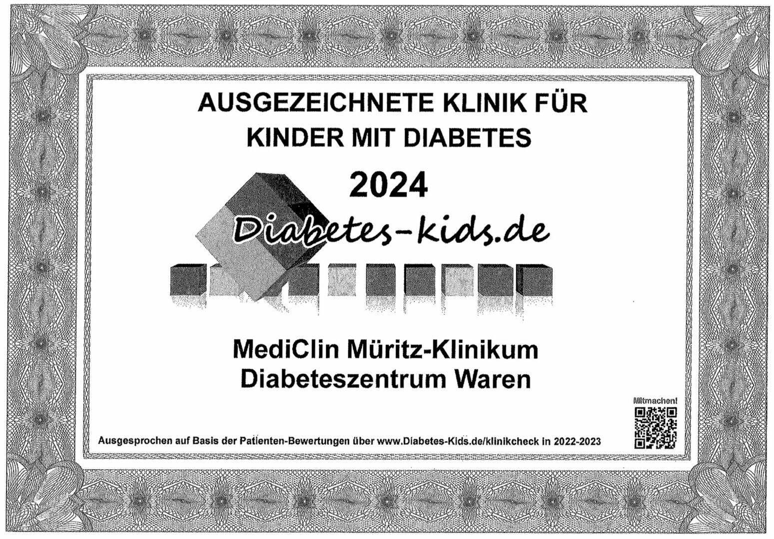 Auszeichnung für das MediClin Müritz-Klinikum: Die Kinder-Diabestesklinik des Hauses hat den Award „Ausgezeichnete Kliniken für Kids mit Typ 1 Diabetes in Deutschland“ erhalten. Die Initiative Diabetes-Kids ist die größte virtuelle deutschsprachige Community für Kinder und Jugendliche mit Typ 1 Diabetes, die bereits seit 23 Jahren besteht. Seit längerem gibt es für Betroffene und deren Eltern die Möglichkeit, Diabetes-Kliniken über einen sehr detaillierten Fragebogen von 16 Fragen bewerten zu lassen. Die Warener Diabetes-Klinik hat in der Bewertung überdurchschnittlich gut abgeschnitten und nun den Award erhalten.