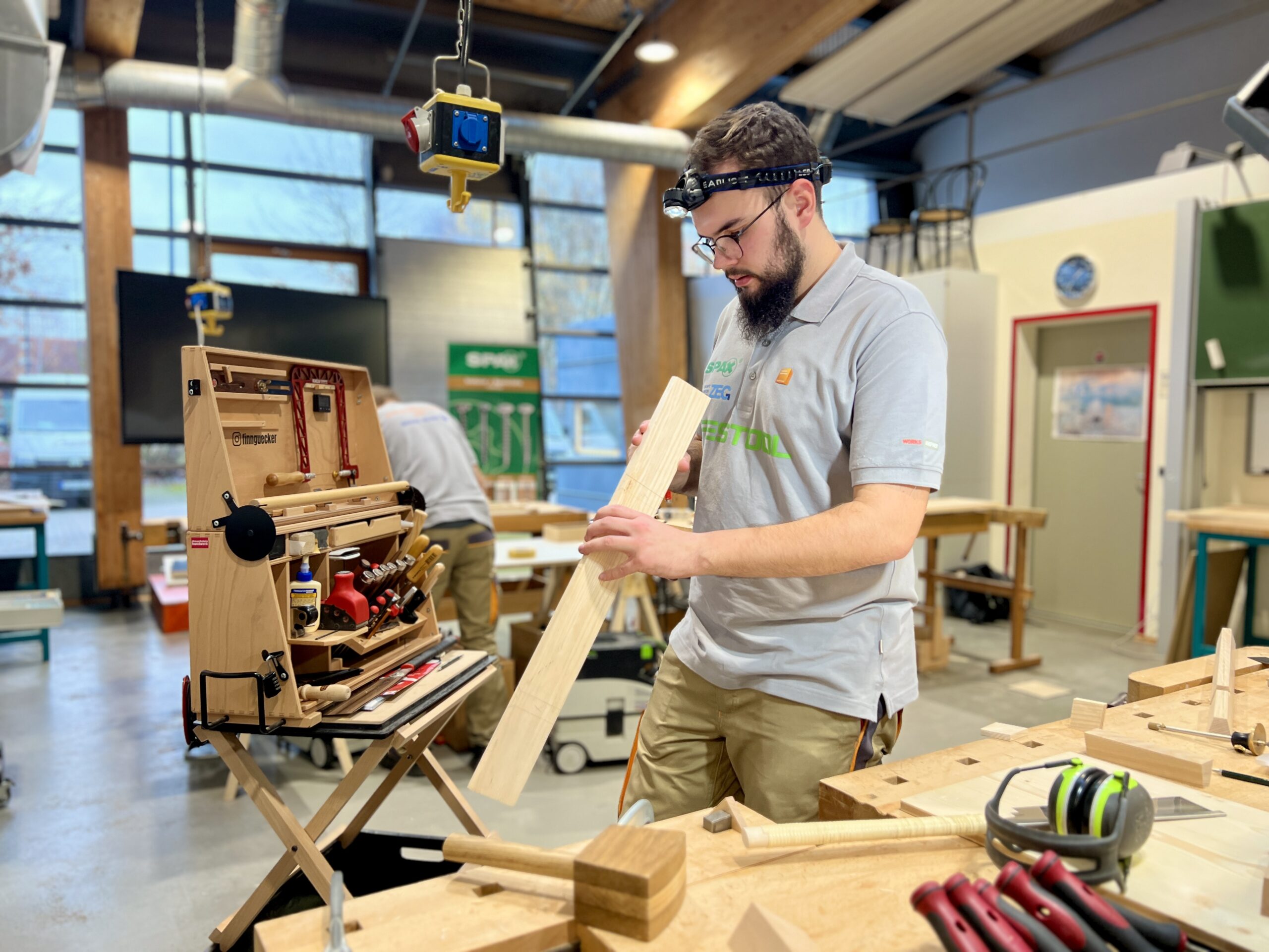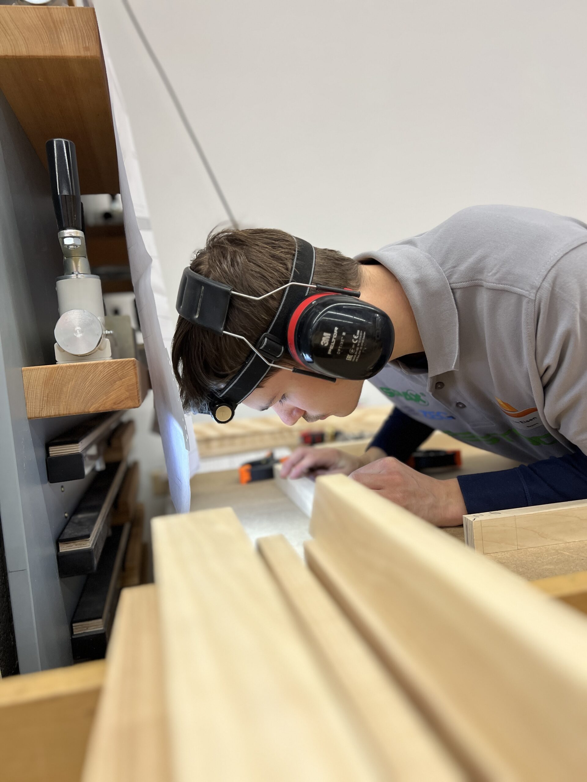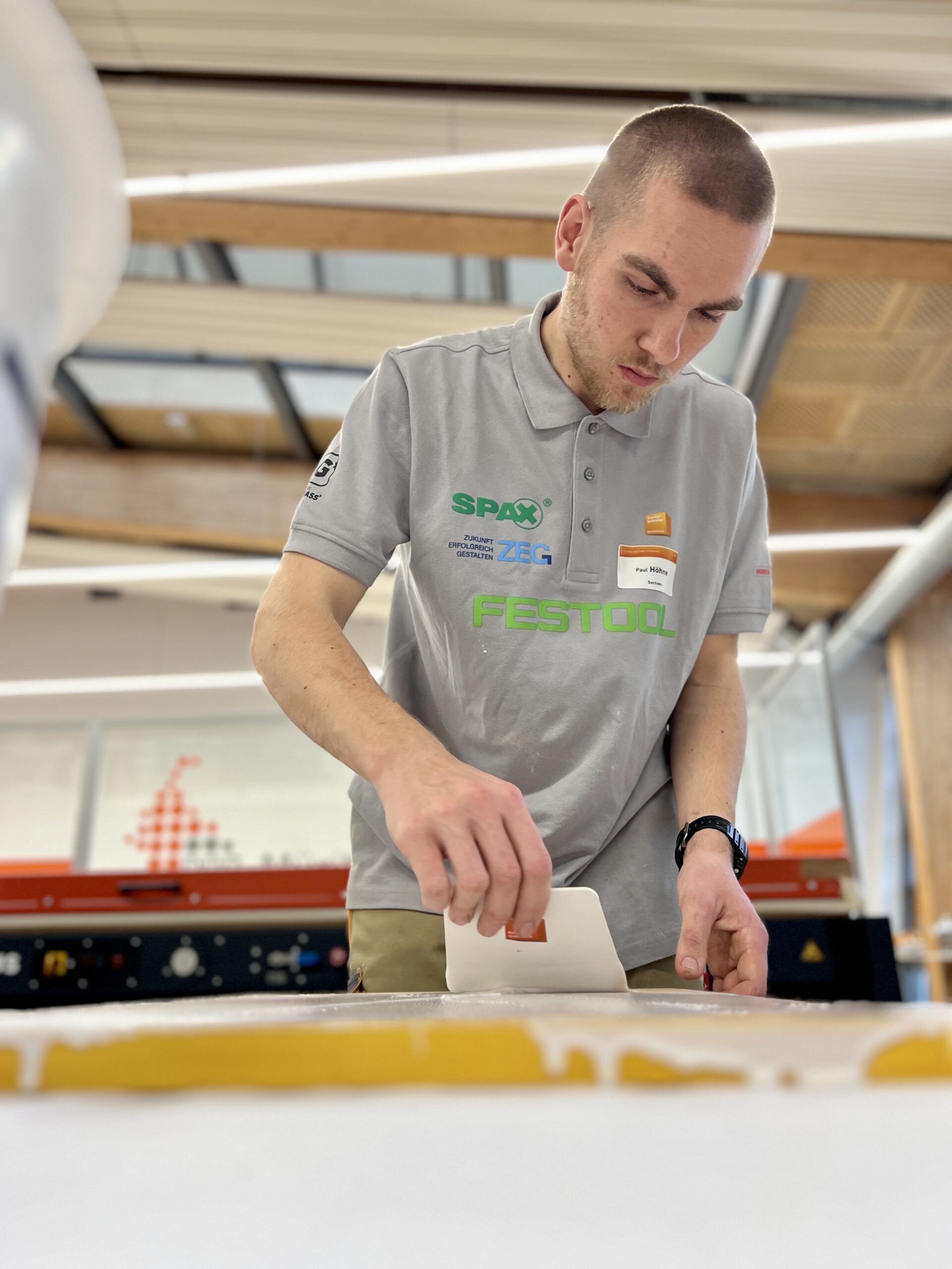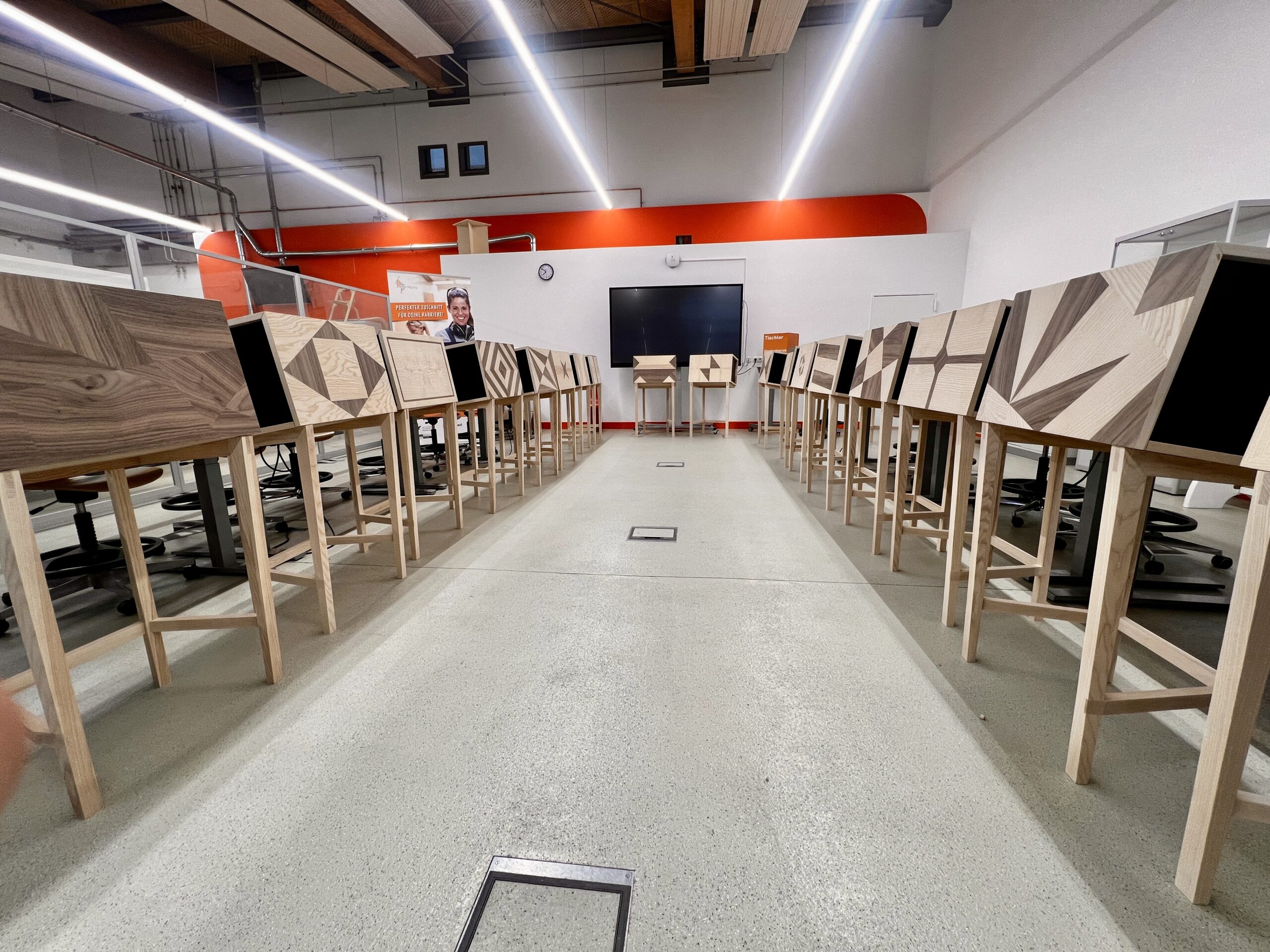 Was die jungen Fachkräfte leisteten, war in jeder Hinsicht beeindruckend: höchste Präzision, bemerkenswertes Zeitmanagement, enorme Konzentration und echtes handwerkliches Können. Alle Teilnehmer mussten eine „Schrägothek“ bauen, ein Designmöbelstück, das es in sich hatte. Genutzt werden kann es als eine Art Mini-Schreibtisch, aber eben mit einer besonderen Form.