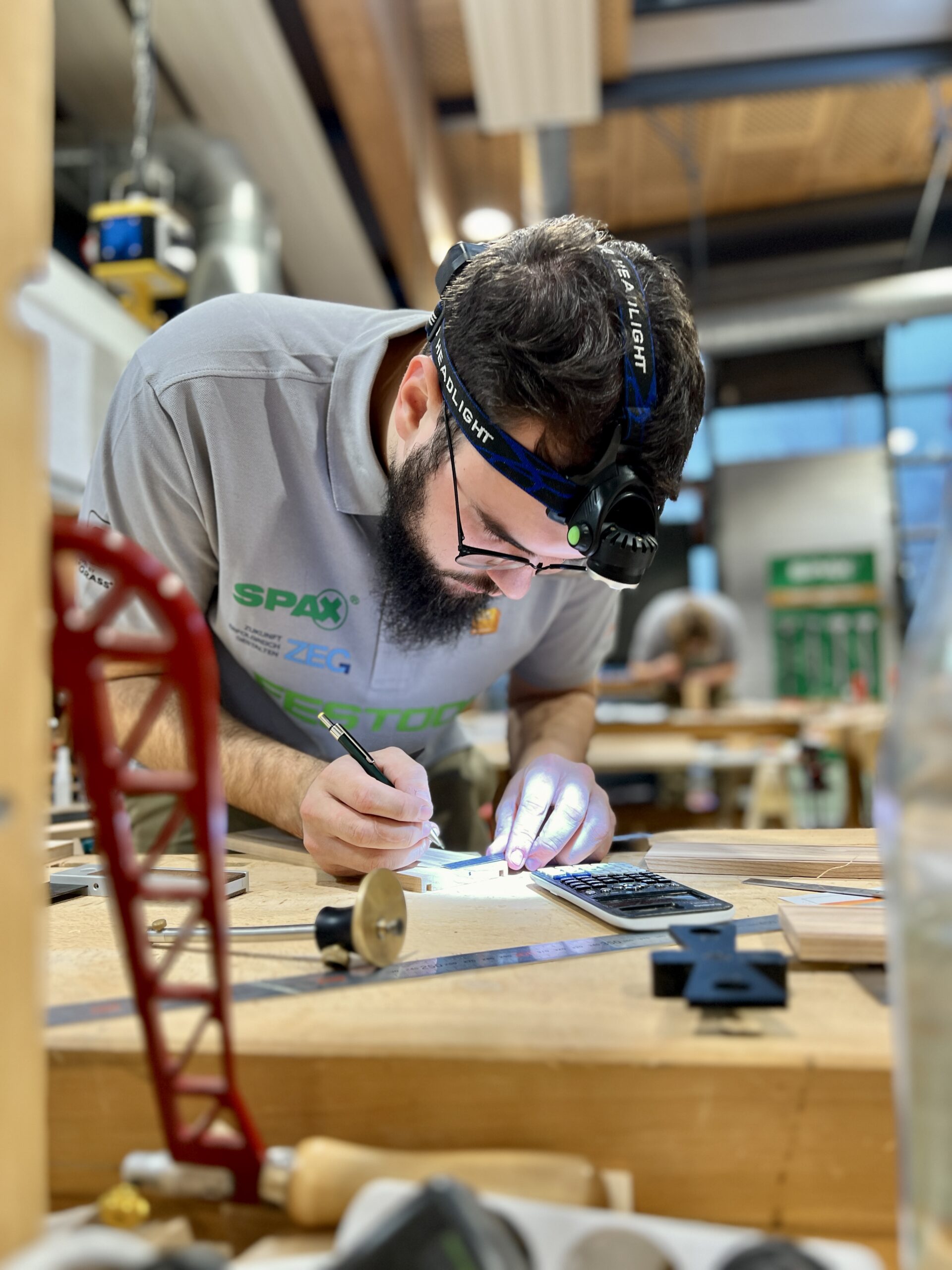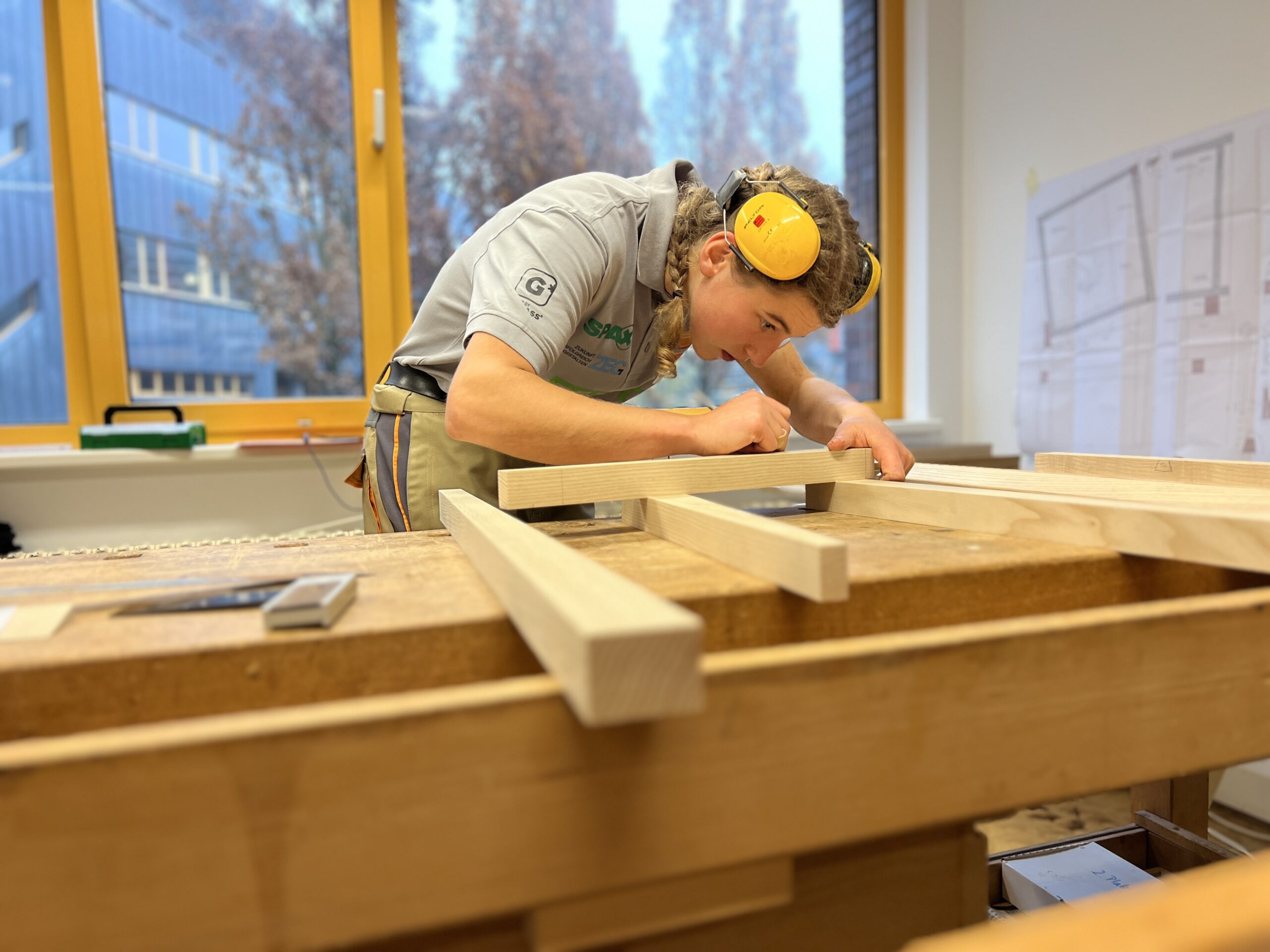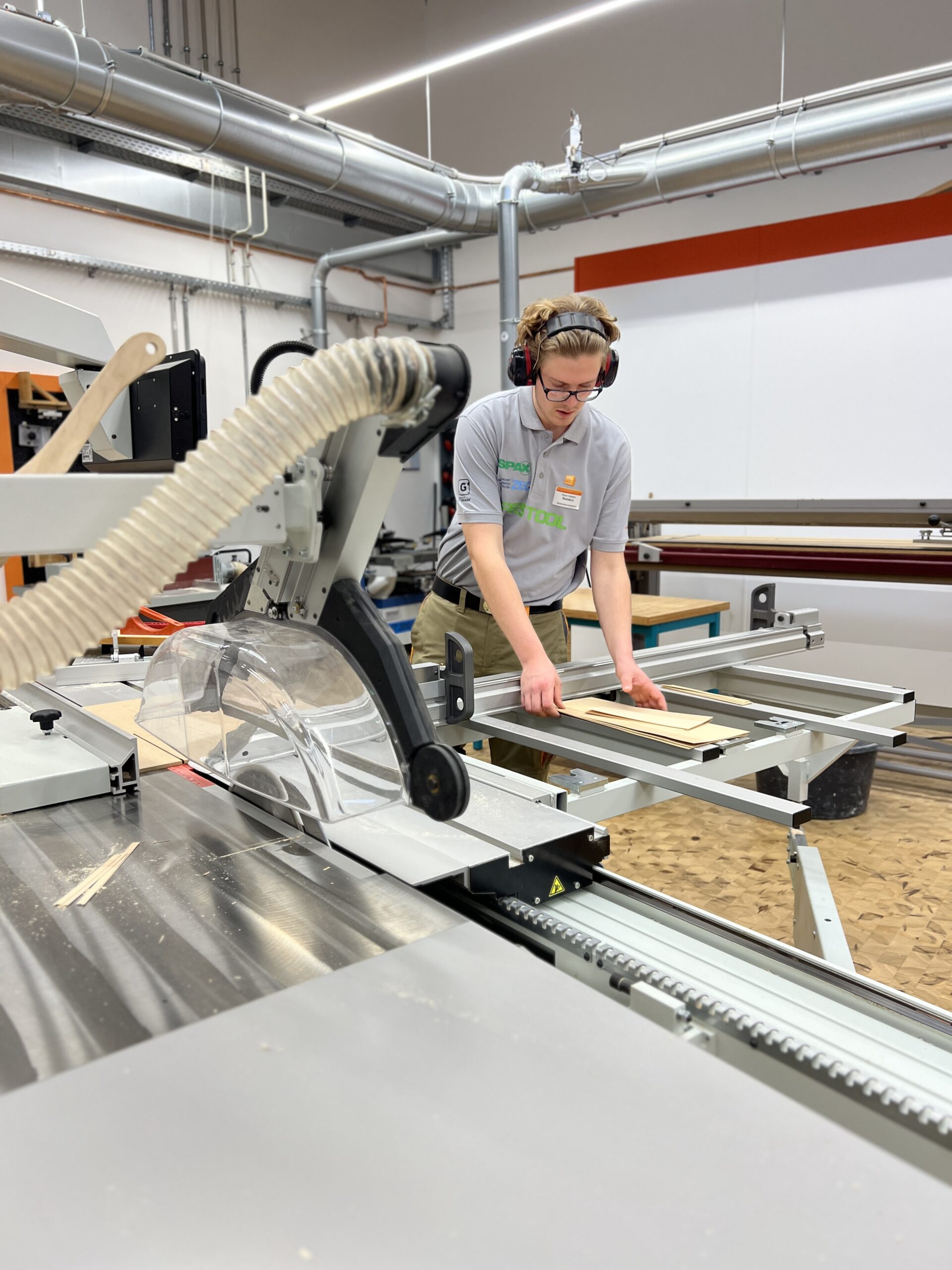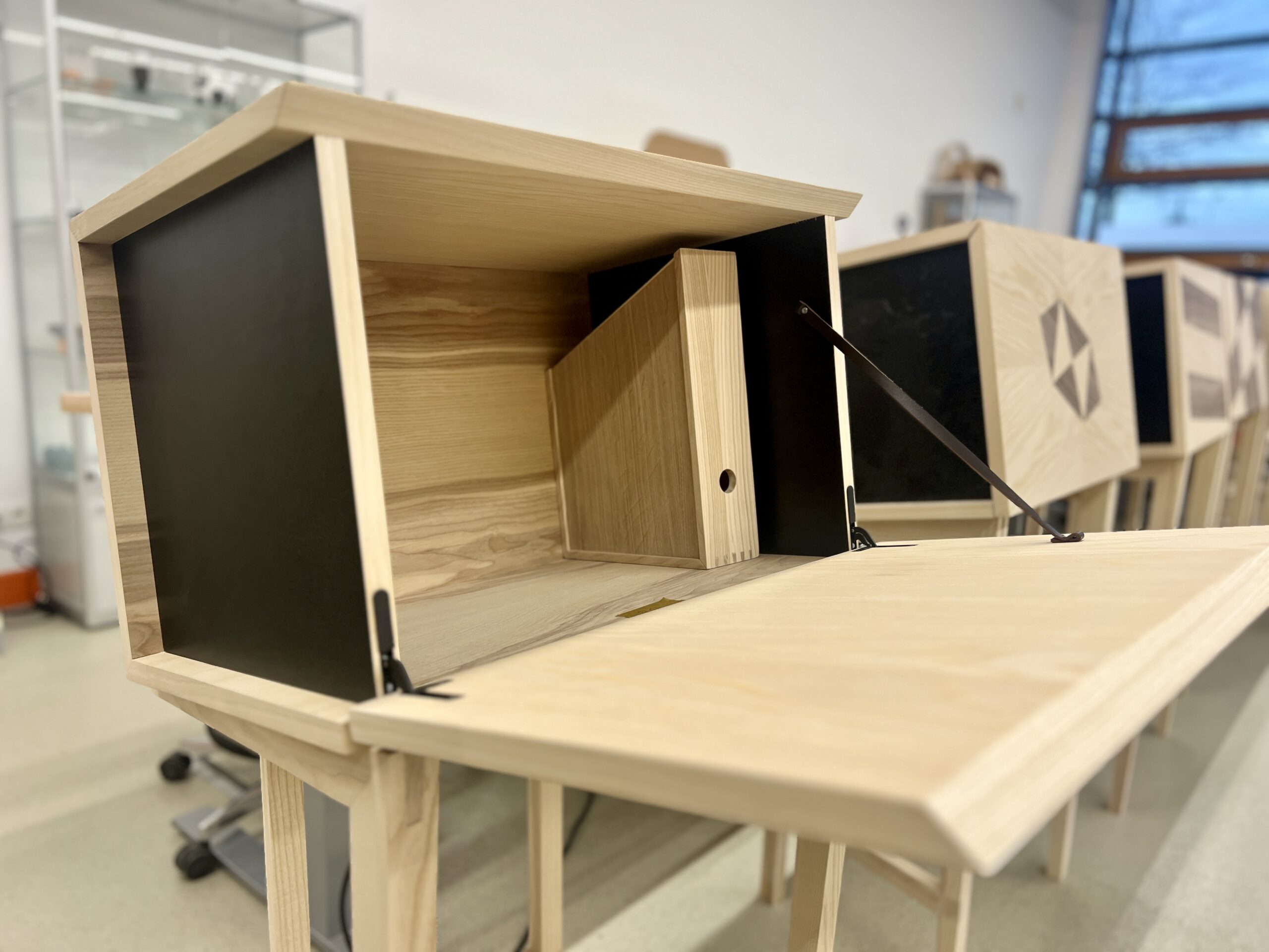 Was die jungen Fachkräfte leisteten, war in jeder Hinsicht beeindruckend: höchste Präzision, bemerkenswertes Zeitmanagement, enorme Konzentration und echtes handwerkliches Können. Alle Teilnehmer mussten eine „Schrägothek“ bauen, ein Designmöbelstück, das es in sich hatte. Genutzt werden kann es als eine Art Mini-Schreibtisch, aber eben mit einer besonderen Form.