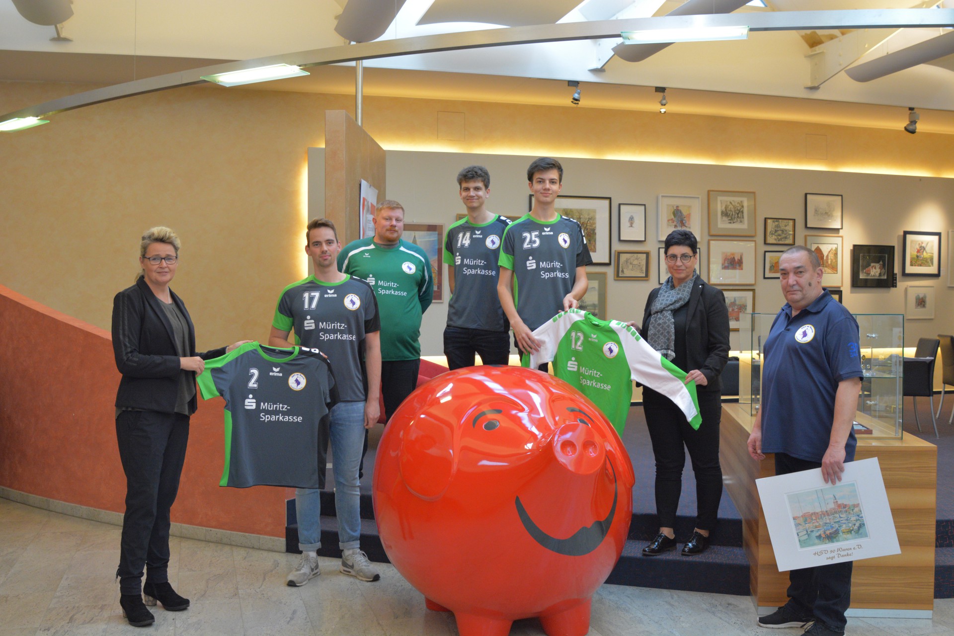 Ganz angetan von den neuen Trikots waren auch Andrea Perlick, Vorstandsvorsitzende der Müritz-Sparkasse, und Maren Melzer, Stellv. Abteilungsleiterin des Vorstandssekretariats, die die Übergabe gemeinsam mit Vereinschef Torsten Pfitzner, Trainer der Männer Max Dräger sowie einigen der Spieler gemacht haben. „Die Trikots sehen richtig gut aus und es macht uns auch stolz, den eigenen Schriftzug darauf zu sehen“, freute sich Andrea Perlick.