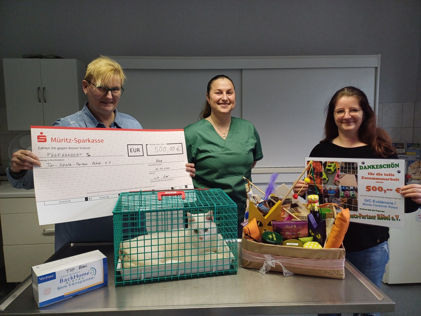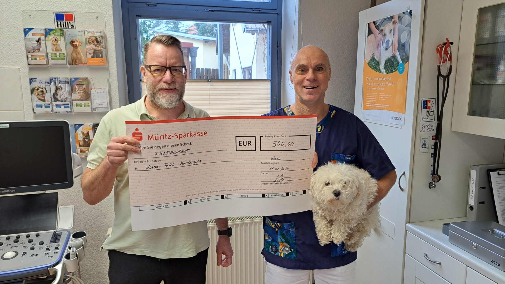 Gleich doppelt gespendet hat die Müritz-Tierklinik um Dr. Holger Nietz: 500 Euro gab’s für die Warener Tafel, die es in diesen Zeiten immer schwerer hat, Lebensmittel für Bedürftige zu besorgen. Und weitere 500 Euro gingen an den Verein Tierschutzpartner Röbel. Die ehrenamtlichen Mitglieder des Vereins kümmern sich seit Jahren rührend um viele Straßenkatzen und haben auch durch die gestiegenen Tierarztkosten immer größere Probleme, die nötigen Gelder aufzubringen.