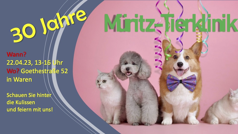 Die Müritz-Tierklinik in der Warener Goethestraße – gegründet von Dr. Holger Nietz – feiert am morgigen Sonnabend, 22. April ihren 30. Geburtstag. Dazu sind alle, die schon immer mal einen Blick hinter die Kulissen werfen wollten, eingeladen. In der Zeit von 13 bis 16 Uhr gibt’s an verschiedenen Stationen viel zu erfahren und zu erleben.