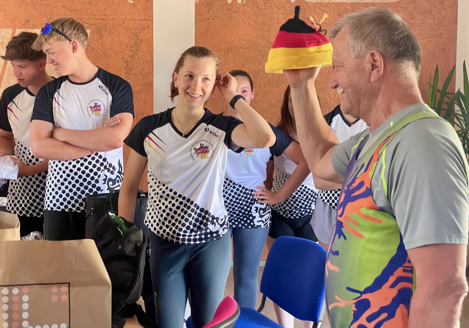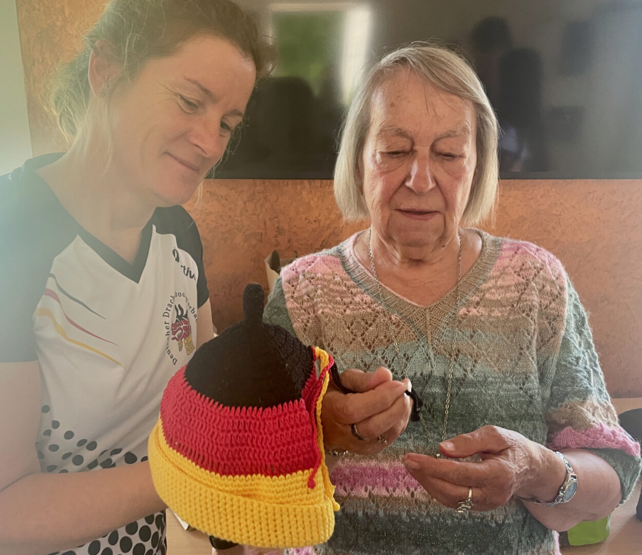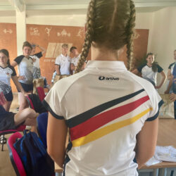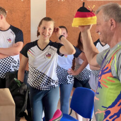 Schon bei der EM im vergangenen Jahr sind die Müritzer mit ihren gehäkelten blau-orangen Mützen in Italien aufgefallen und hatten viele Nachfragen, wo es diese tollen Kappen denn gibt. Als es jetzt hieß, dass die Müritzer als Deutsche Nationalmannschaft in Prag starten, zögerte die agile Seniorin nicht lange und häkelte die Kappen in den Deutschland-Farben. War gar nicht so leicht, wie die 84-Jährige berichtet, denn vor allem schwarze Wolle war nur schwer zu finden. Für die Mädchen hat sie dann noch Kordeln mit Perlen an die Mützen gezaubert. Die Warenerin ist seit rund 60 Jahren Mitglied im ESV, leitet nach wie vor Turngruppen und hat den „Jungschen“ gestern bei der obligatorischen Erwärmung gezeigt, wie fit sie noch ist. Der ein oder andere Jugendliche sah ziemlich alt aus, als es darum ging, mit gestreckten Beinen den Fußboden zu berühren. Für Grete Jungnitsch ist das kein Problem.