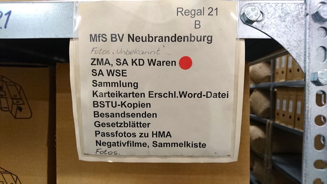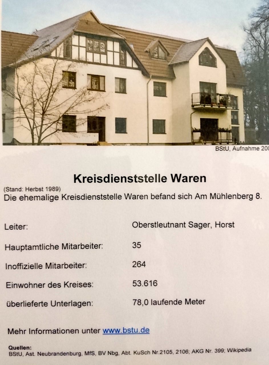 „In der Kreisdienststelle Waren wurden mit 78 Metern laufende Akten und Papiere die meisten Unterlagen im damaligen Bezirk gesichert“, sagte die Leiterin der Außenstelle des Bundesbeauftragten für die Aufarbeitung der Stasi-Hinterlassenschaften (BStU) in Neubrandenburg, Marita Richter gegenüber „Wir sind Müritzer“. Also 78 Meter Akten von 35 hauptamtlichen und 264 inoffiziellen Mitarbeitern für rund 53 000 Einwohner des damaligen Kreises Waren.