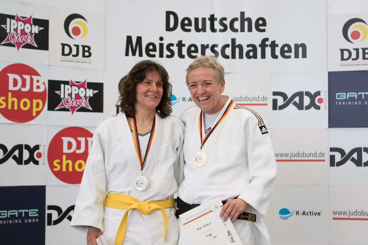 Evelyn Bank (Fotorechts) profitierte von der mangelnden Teilnehmerzahl in ihrer Alters- und Gewichtsklasse und darf sich nun trotz ihrer Niederlage deutsche Vizemeisterin nennen. Angesichts ihrer bisher erst sehr kurzen Judo-Erfahrung großen Respekt, dass sie sich dieser Herausforderung gestellt hat.