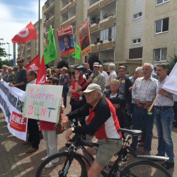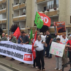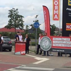 Die Demo der NPD, die unter dem Motto „Asylmissbrauch macht arm“ auf dem Papenberg steht, wird von deutlich mehr Gegendemonstranten, die eine „Aktive Willkommenskultur“ fordern, begleitet. Beide Gruppen – rund 15 Leute auf der NPD-Seite und etwa 65 bei den Gegendemonstranten – stehen sich dort noch bis 16 Uhr, nur getrennt durch eine Straße und flankiert von viel Polizei, gegenüber.