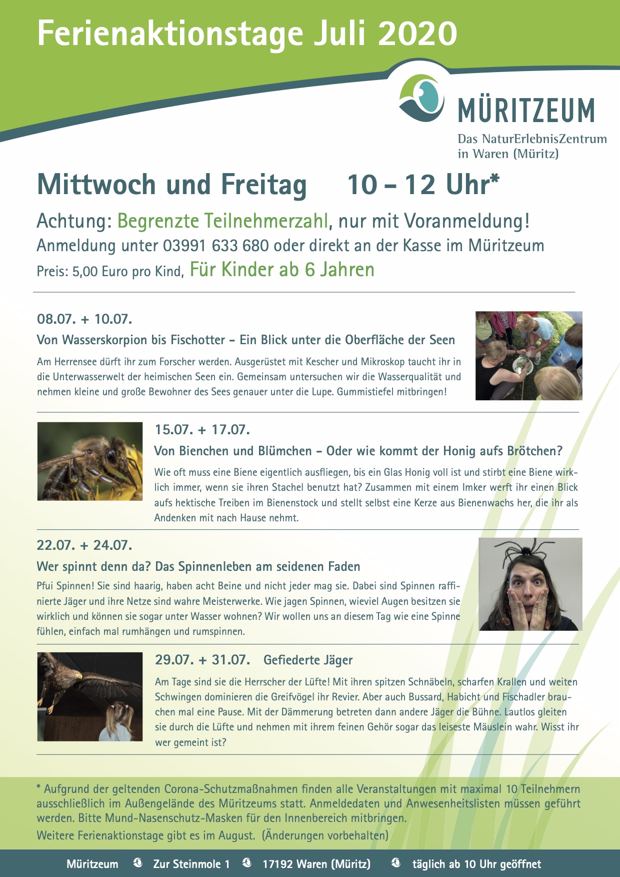Auf die Ferienkinder ab 6 Jahren warten spannende Themen und jede Menge Naturentdeckungen mit den Umweltbildnerinnen des Müritzeums. Die Ferienaktionstage werden auch noch im August angeboten, wenn in anderen Bundesländern noch Sommerferien sind. Eine telefonische Anmeldung (03991 633 680) zu den Terminen ist aufgrund der begrenzten Teilnehmerzahl zwingend erforderlich.