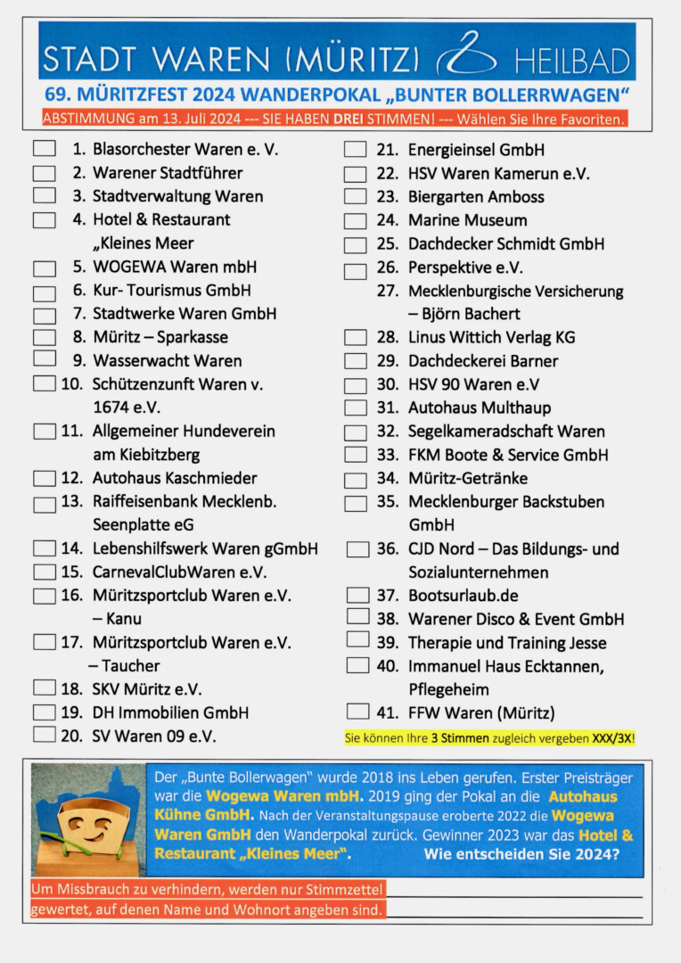 Kann das Team des Hotels und Restaurants „Kleines Meer“ den Pokal verteidigen, holt sich der schon zweimalige Gewinner WOGEWA den „Bunten Bollerwagen“ wieder oder gibt es einen ganz neuen Sieger beim großen Umzug zum Warener Müritzfest? Fest steht, dass er in diesem Jahr ziemlich lang wird, mehr als 40 „Bilder“ sind angemeldet und wollen um 11 Uhr am morgigen Sonnabend in der Gerhart-Hauptmann-Allee durch die Stadt starten. Wie auch in den Vorjahren gibt es eine riesige Jury – nämlich das Publikum. Entsprechende Stimmzettel sind zum einen in der Waren (Müritz)-Information erhältlich, zum anderen direkt an der Bühne, man darf es sich aber auch ganz einfach machen und den Zettel hier bei „Wir sind Müritzer“ ausdrucken. Abgeben kann man die ausgefüllten Zettel bis um 13.30 Uhr wieder direkt an der Bühne. Jeder hat drei Stimmen – die kann man auf drei verschiedene Teilnehmer des Umzugs verteilen oder auch nur einem geben. Es ist also sinnvoll, mit einem Stift „bewaffnet“ zum Festumzug zu gehen.