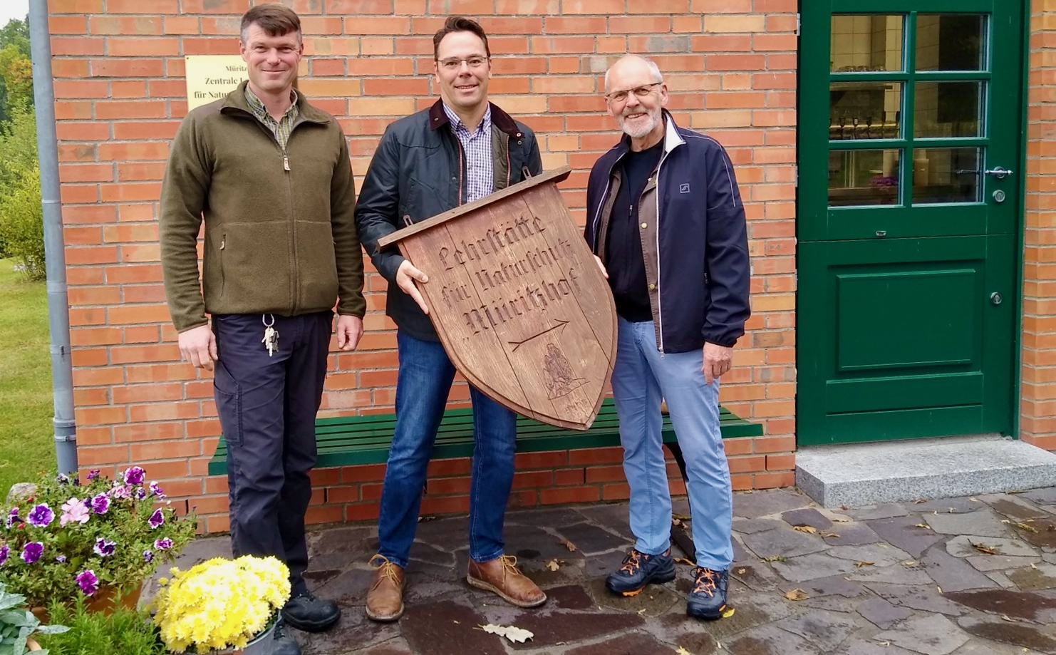 Ein Stück deutscher Naturschutzgeschichte hat eine neue Heimat gefunden: David Wülferling, zuständig für Liegenschaften im Lebenshilfswerk Waren, und André Neitzel, Leiter des Landschaftspflegehofs Müritzhof, übergaben dem Studienarchiv Umweltgeschichte an der Hochschule Neubrandenburg ein historisch bedeutsames Naturschutzschild. Das hölzerne Schild hing mehr als 35 Jahre neben der Eingangstür des beliebten „Müritzhofs“ bei Waren, auf dem am 14. September 1954 die „Lehrstätte für Naturschutz“ der DDR eröffnet wurde – die erste staatliche zentrale Naturschutzlehrstätte weltweit. Ihr erster Leiter war Kurt Kretschmann, der Erfinder der bekannten „Naturschutzeule“, die bis heute Naturschutzgebiete kennzeichnet.