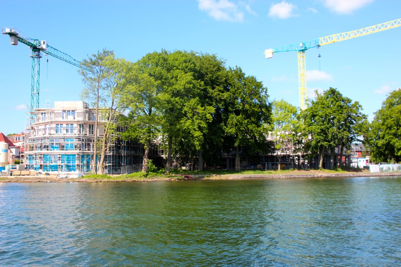 Wir haben am 30.März 2017 noch genau 16 Bäume wasserseitig vor dem Neubau gezählt. Unsere Meinung: Die haben keine Chance! Von allen Bäumen waren schon unzählige Äste abgesägt worden. Und wie schnell so ein Baum – ein Lebewesen!- verschwinden kann, haben uns in jüngster Vergangenheit ja einige Kapitalisten eindrucksvoll bewiesen.