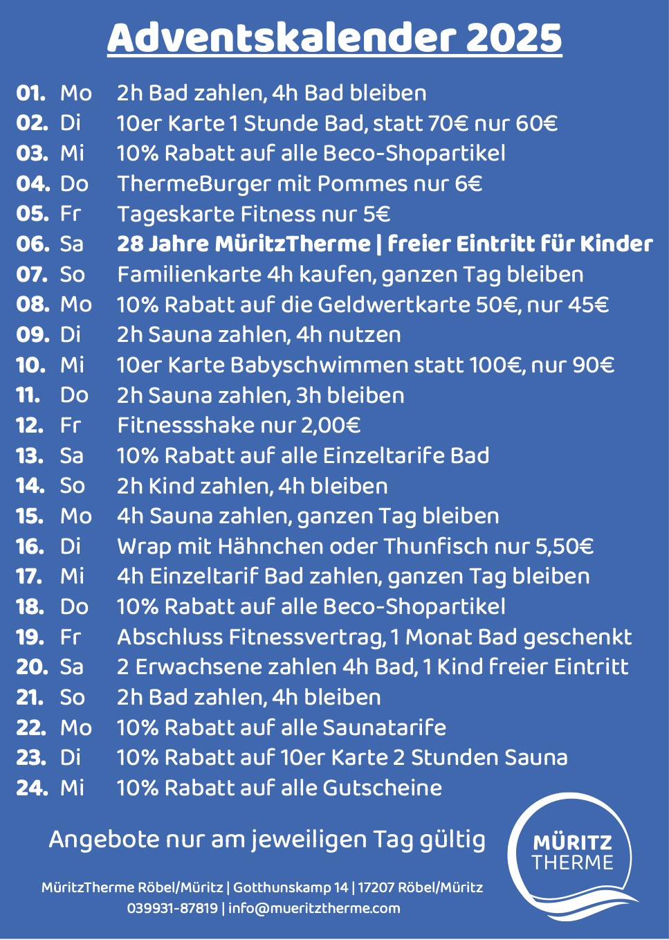 Drei Wochen Schließzeit waren angekündigt, und drei Wochen Schließzeit sind trotz sehr umfangreicher Arbeiten in der Röbeler MüritzTherme auch eingehalten worden. Heute öffnet das Bad wieder, und schon am Montag wartet das nächste Highlight – Der Therme-Adventskalender mit täglich neuen Angeboten.