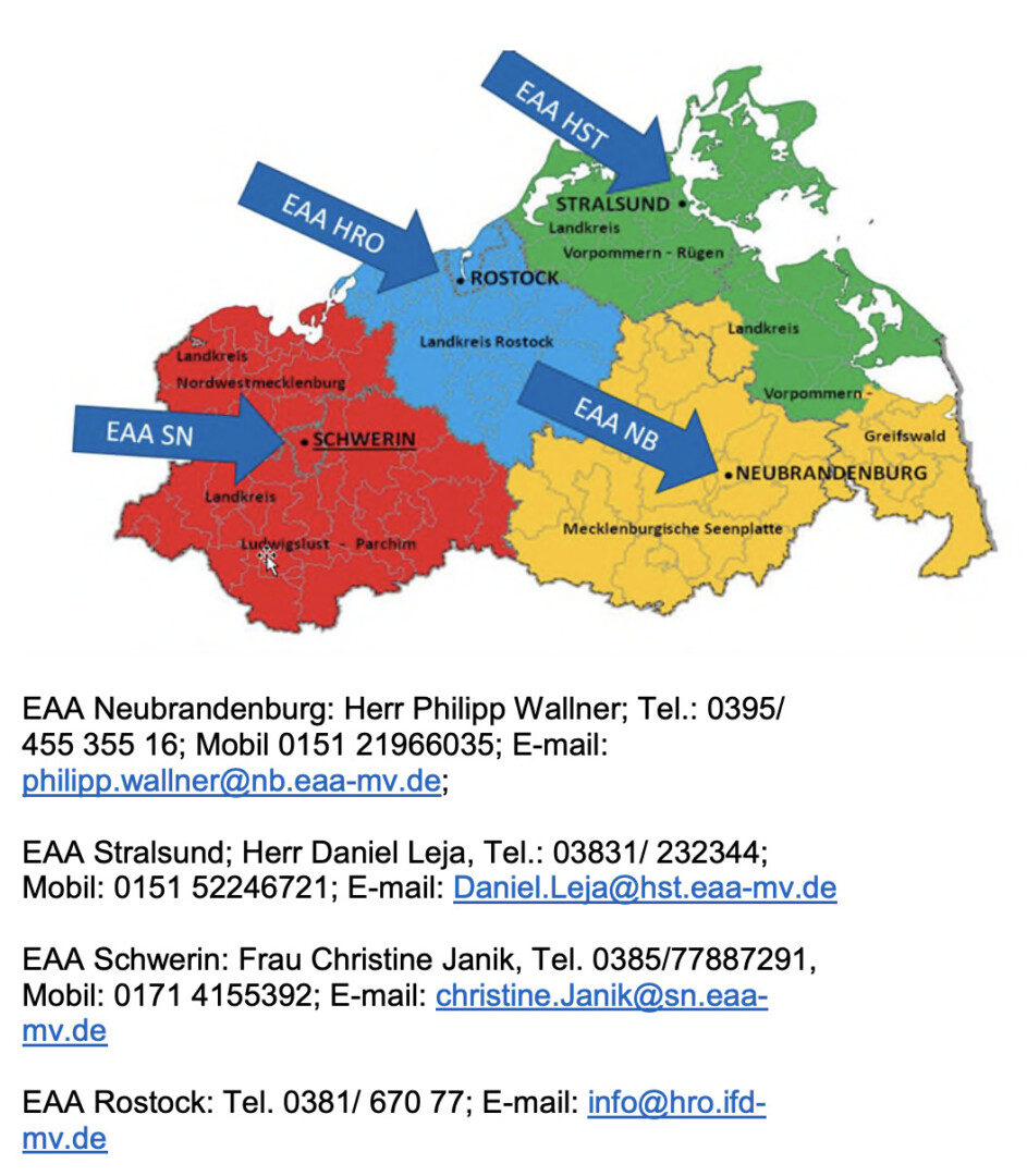 Für alle Themen rund um die Beschäftigung schwerbehinderter Menschen stehen Arbeitgebern in Mecklenburg-Vorpommern jetzt vier Einheitliche Ansprechstellen für Arbeitgeber, kurz EAA, zur Verfügung. Die EAA wurden insbesondere auf Wunsch der Unternehmen eingerichtet. Viele Firmen zögern noch immer, wenn es darum geht, Menschen mit Behinderungen als Arbeitskräfte zu gewinnen. Sie vermuten unter anderem bürokratische Hürden. Die EAA sorgen dafür, dass den Unternehmen ein Ansprechpartner zu diesem Thema zur Verfügung steht, der alle Fragen zum Thema beantwortet, die Fördermöglichkeiten kennt, die Firmen kompetent berät und ihnen praktisch bei der Umsetzung hilft.